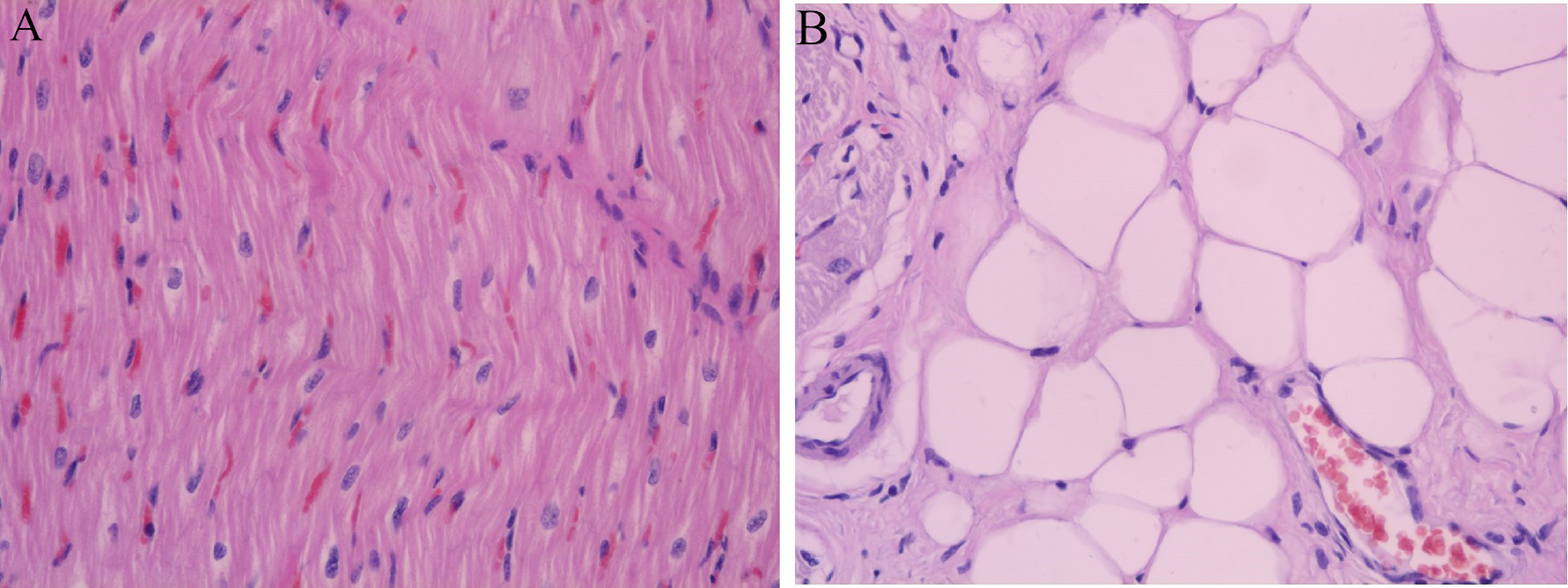 (A) normal group HE staining, magnified 400 fold, normal myocardial HE staining was pink, cytoplasm, nucleus and tissue structure was clear; (B) Myocardial infarction group HE staining, magnified 400 fold, cytoplasmic transverse lines disappeared, forming different depth of transverse band, nuclear pyknosis, fragmentation dissolution.