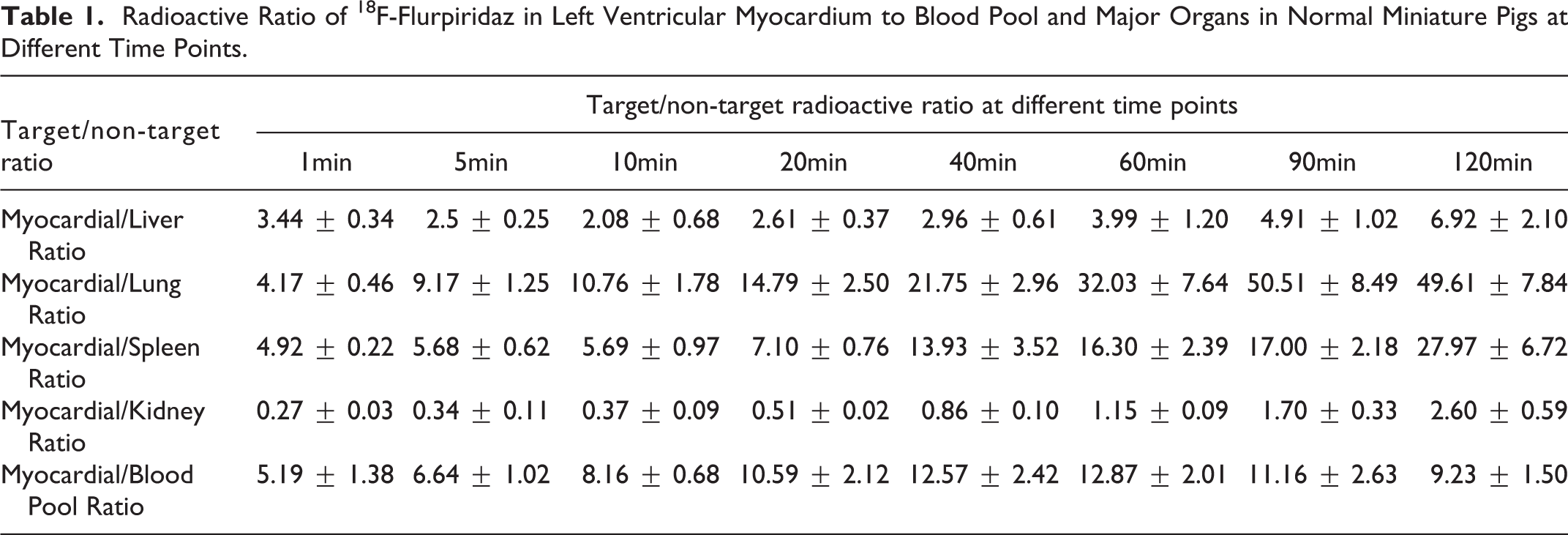 Radioactive Ratio of 18F-Flurpiridaz in Left Ventricular Myocardium to Blood Pool and Major Organs in Normal Miniature Pigs at Different Time Points.