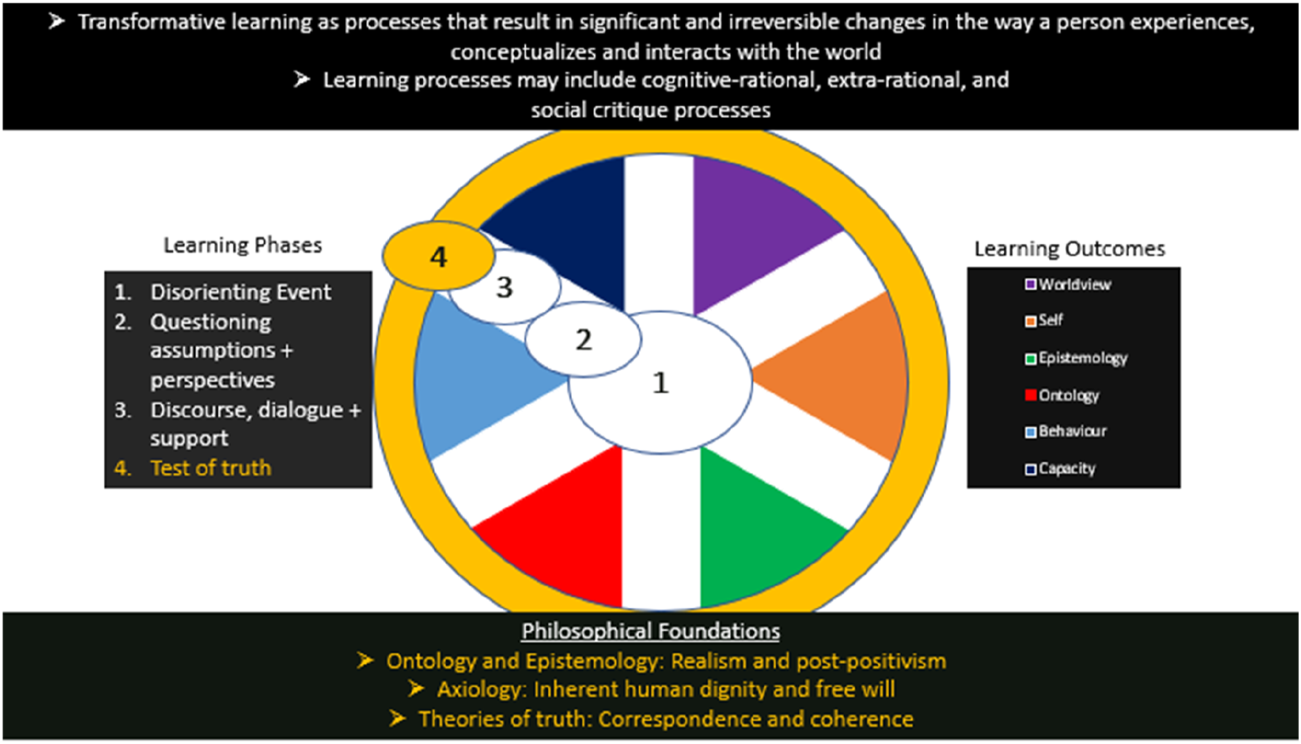 Based upon the above-described integrative approach to learning processes, and Hoggan’s (2016) definition of transformative learning and typology of related learning outcomes, I recently developed a reconceptualised model for transformative learning (Roux, 2025a). This conceptualisation (see Figure 1 below) adapts Cranton’s (2016) three-phase model which integrates the learning processes identified above. These include 1: Disorienting event; 2: Questioning assumptions and perspectives; 3: Discourse, dialogue and support (Cranton, 2016, pp. 46–60). This conceptualisation however also includes a fourth phase: A reconceptualisation of transformative learning that includes the test of truth (Roux, 2025a).