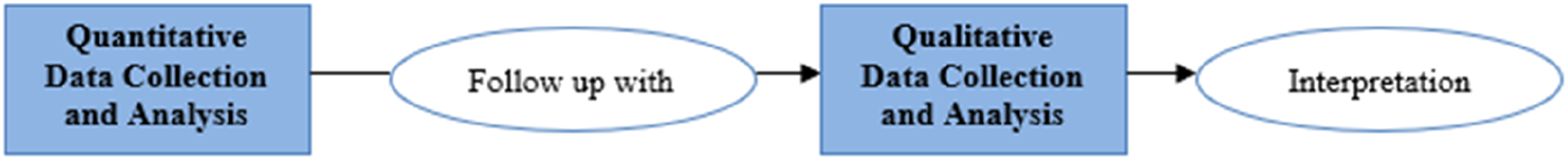 This mixed-methods retrospective case study used an explanatory sequential design, incorporating surveys and semi-structured interviews to explore learning experiences (Creswell & Plano-Clark, 2007) (see Figure 2). This methodology prioritizes the qualitative phase over the quantitative phase (p. 86) and adapts interview questions based on survey data for in-depth exploration. Data were acquired using an adapted validated survey tool contiguous with the study (Stuckey et al., 2013), whilst the interviews were completed via Zoom, transcribed, and the results were analysed using thematic analysis (Peel, 2020). This included foregrounding the participants’ experience and creating rich descriptions that emanated from transcription extracts, thus using participants’ own words to inform the classification of data into units of analysis (p.3). In this manner, propositions were developed based on interpretations that were formed by the data and informed by the literature in a contextualised manner (p. 9–10). Explanatory sequential design based on Creswell and Plano-Clark (2007, p. 69).