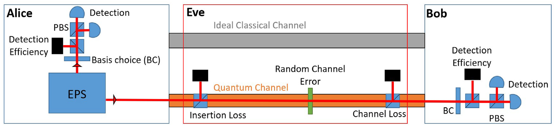 Illustration of an effective optical hardware setup. One photon from each pair is directed to Alice’s detectors and the other is sent through the quantum channel to Bob. BC is the basis choice, e.g., an ideal fast variable waveplate with two settings that chooses the measurement basis for each measurement. All non-polarizing beamsplitters have reflectivity according to the loss they model. Channel loss accounts for the loss per unit length light experiences while propagating in the fiber. All loss at fiber inputs, outputs, and interfaces is combined into a single insertion loss coefficient Λ. Eve is assumed to have maximal information allowed by physics, and thus all errors are attributed to Eve and all information sent through a channel can be measured by Eve.