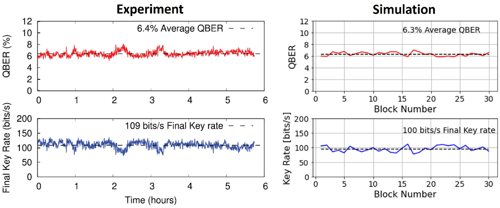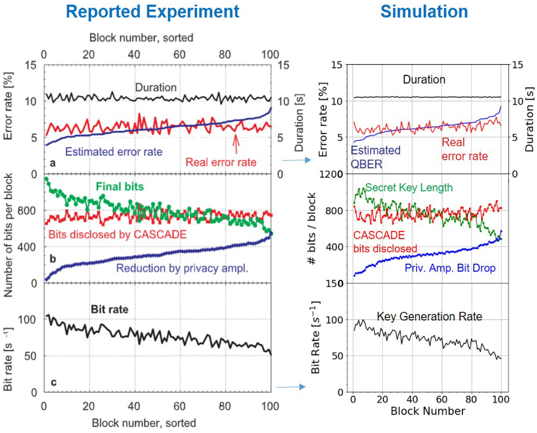 Each block corresponds to 25 s of time in the experimental plot, so our simulation spans 12.5 min of QKD, which is sufficient for comparison. There is time-dependent variation in the experiment that we do not include in our model. The simulated QBER is statistically consistent with the reported average result. Note that the L benchmark text specifies an average QBER of 6.3% while their figure is labeled with 6.4%. The key generation rate is slightly lower than the average experimental reported value while the sifted key lengths are consistent. This indicates a slight difference in classical post-processing after key sifting (Figure 1) and likely stems from differences between our Cascade implementations. Even so, the simulated secret key generation rate is within one standard deviation of the average reported value, and the agreement of the sifted key lengths validates the accuracy of the channel model. We consider these results a compelling approximation of the actual measured QKD performance.