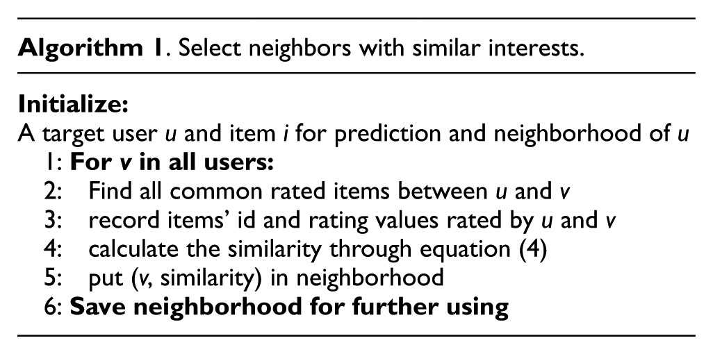 In this algorithm, the similarity between different users is obtained so that neighbors who have the similar interests with each other could be selected. And this is the first step in ICFR approach. Then, social trust is integrated into proposed approach to select those users with both high similarity and trust degree.