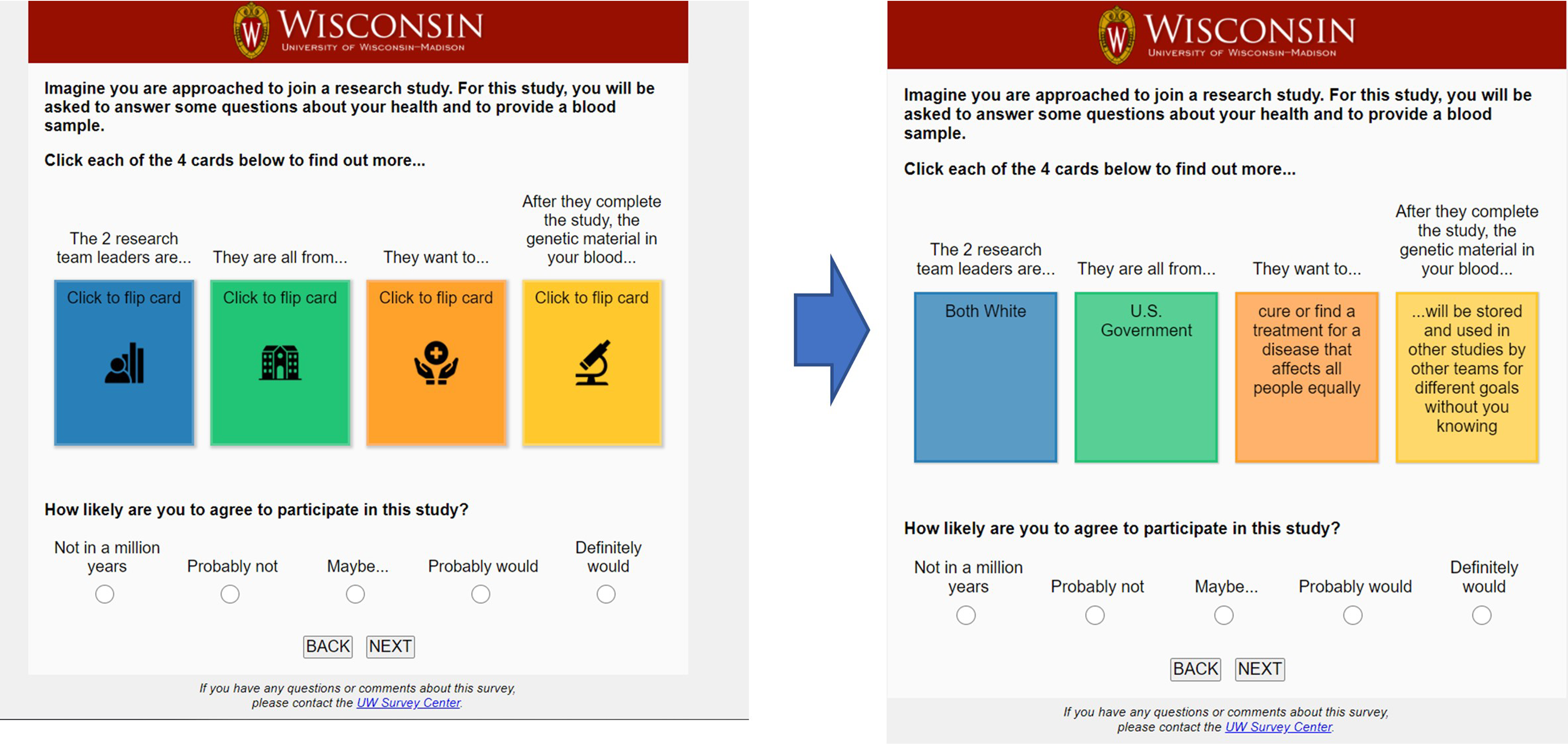 The University of Wisconsin – Madison Survey Center developed the infrastructure for a mobile based administration of the survey using “virtual” cards representing a range of research study attributes (form of consent, diversity of the research team, research goal, and institutional affiliation) that was optimized for mobile and other devices. As noted, participants were presented with eight research “opportunities” or scenarios. Each scenario involved a genomics research study (uses DNA to explore genetic connections to disease) that varied on a set of attributes (presented in Table 1). Each participant saw eight scenarios with random assignment of the 4 factors x 3 characteristics. As such, all participants saw individually generated scenarios varying on the constellation of characteristics. However, no participants were presented with the same constellation of characteristics more than once.
