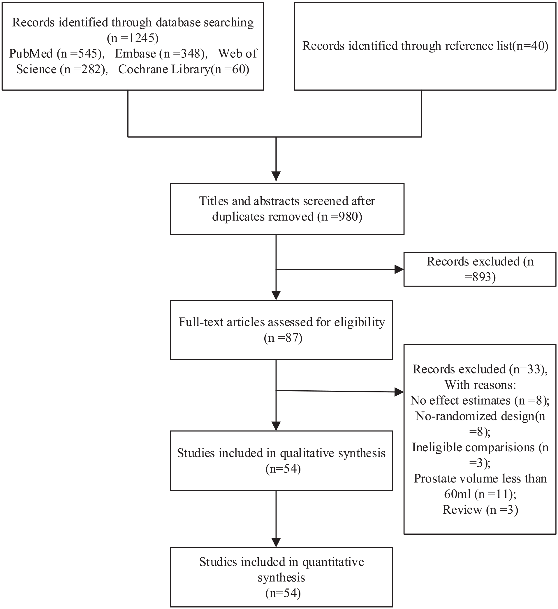 We identified 1,245 and 40 articles from database searching and records identified through references lists, respectively. After eliminating 305 duplicate articles, the total number of articles was 980. Of those, 893 articles were excluded on the basis of the abstract and title reviews. Of the remaining 87 articles with the full texts reviewed, 54 articles in 52 trials met our inclusion criteria for the systematic review and meta-analysis. The 52 eligible RCTs enrolled a total of 6,947 participants and evaluated 10 different surgical treatments for BPH with volume > 60 mL. Figure 1 presents the flow diagram detailing the search strategy and identification of studies used in evidence synthesis.