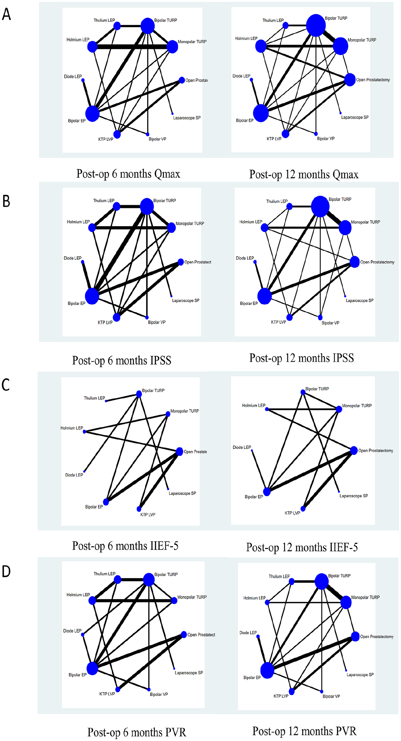 Network of Treatment Comparisons of Functional Outcomes at 6 and 12 Months: (A) Qmax at 6 and 12 Months, (B) IPSS at 6 and 12 Months, (C) IIEF-5 at 6 and 12 Months, and (D) PVR at 6 and 12 Months.
