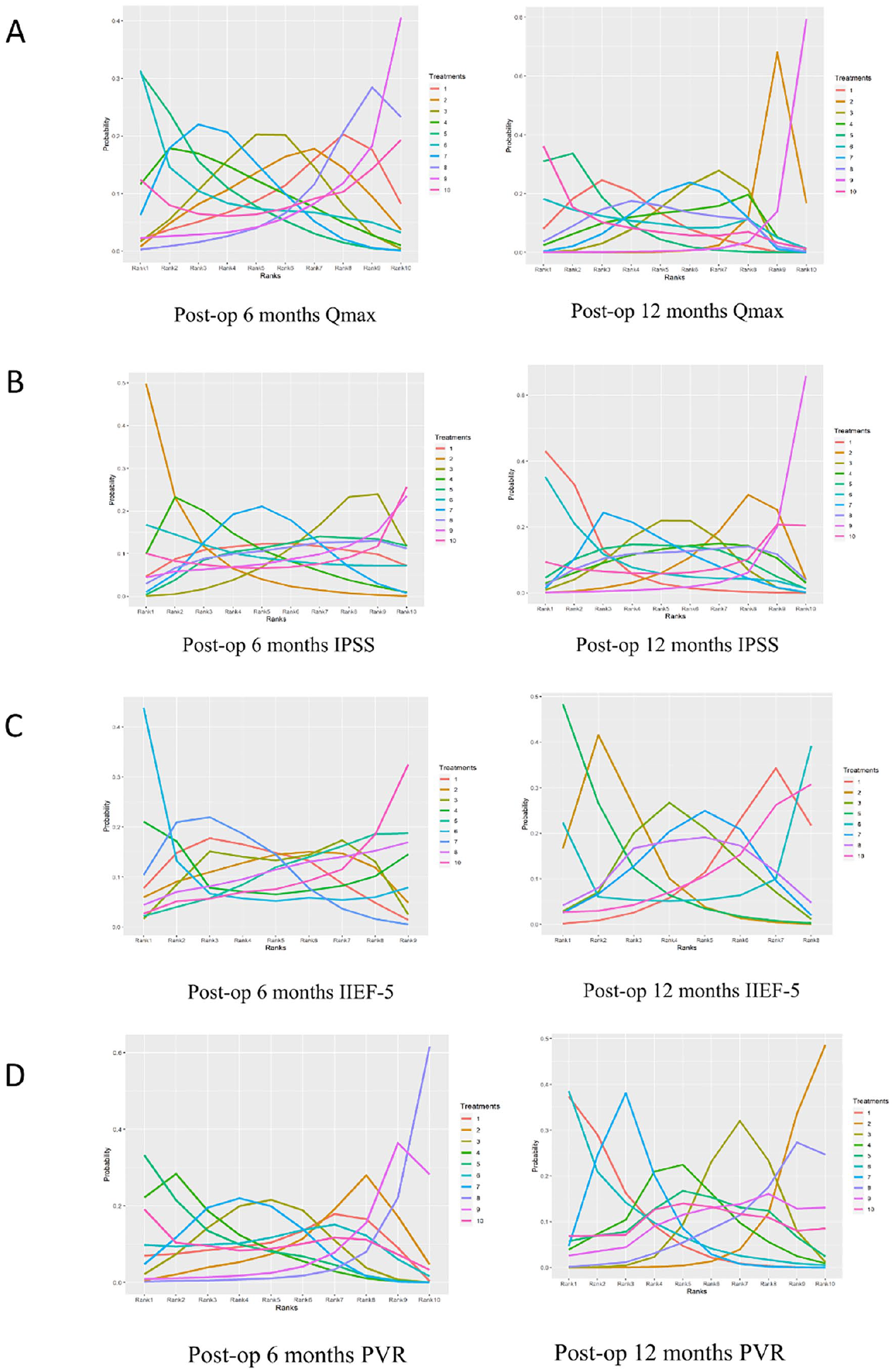 Rank Plot of 10 Surgical Methods of BPH for Functional Outcomes at 6 and 12 Months: (A) Qmax at 6 and 12 Months, (B) IPSS at 6 and 12 Months, (C) IIEF-5 at 6 and 12 Months, and (D) PVR at 6 and 12 Months.