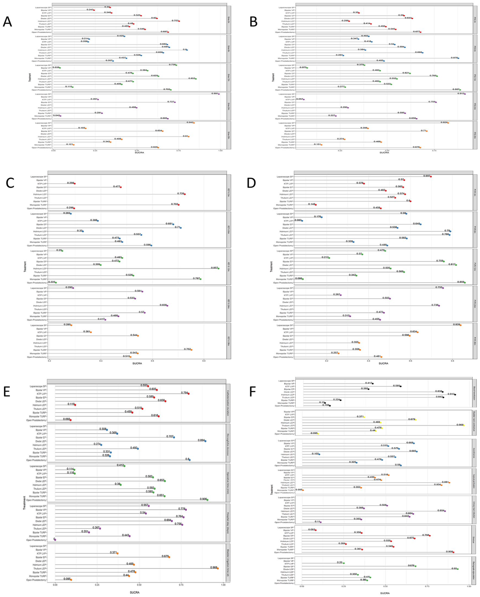 SUCRA of 10 Surgical Methods of BPH for Functional Outcomes, Perioperative Parameters, and Complications: (A): Qmax at 3, 6, 12, 24, and 36 Months; (B) IPSS at 3, 6, 12, 24, and 36 Months; (C) IIEF-5 at 3, 6, 12, 24, and 36 Months; (D) PVR at 3, 6, 12, 24, and 36 Months; (E) Catheterization Duration, Hemoglobin Decrease, Operative Time, Hospital Stay, and Bladder Irrigation Time; and (F) Blood Transfusion, Bladder Neck Contracture, Incontinence, Capsule Perforation, Urinary Tract Infection, Urinary Stricture, and Retrograde Ejaculation.