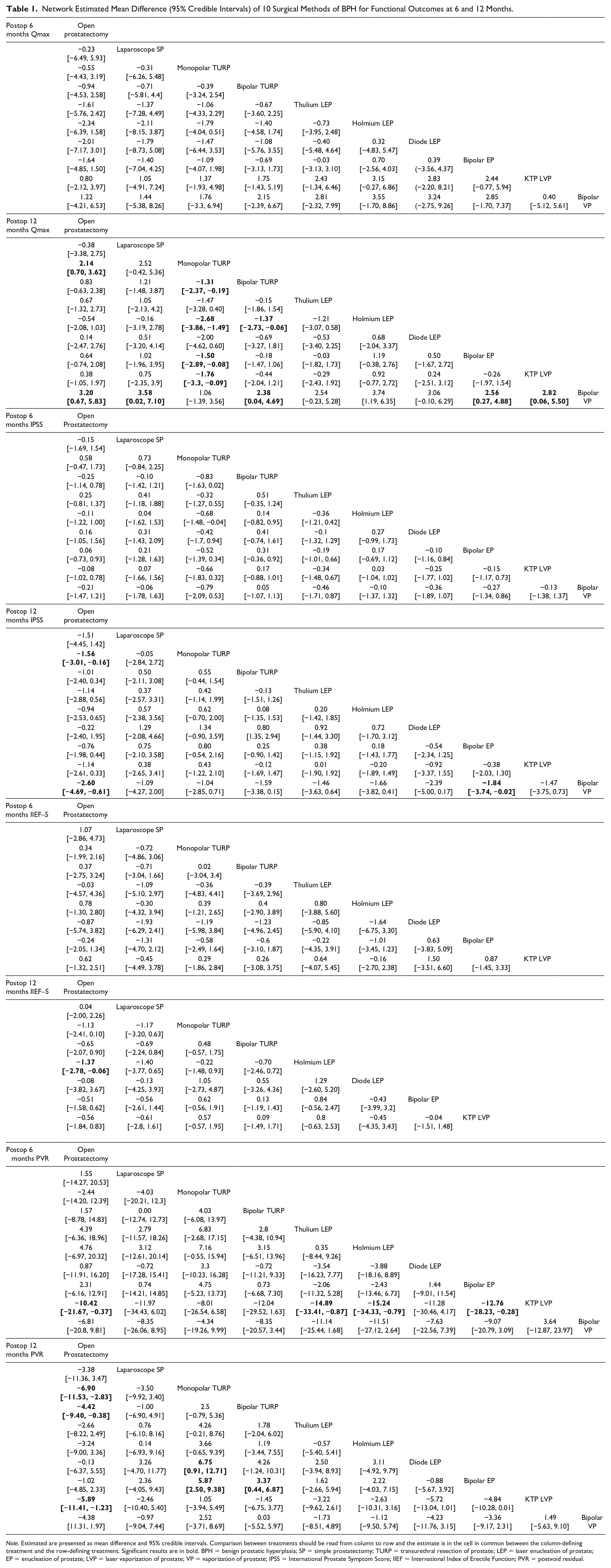 The primary objective of this network meta-analysis was to evaluate the functional outcomes of patients concerning the following clinical parameters: postoperative maximum urinary flow rate (Qmax), International Prostate Symptom Score (IPSS), International Index of Erectile Function–5 (IIEF-5), and postvoid residual volume (PVR) at 3, 6, 12, 24, and 36 months after surgical treatment.
