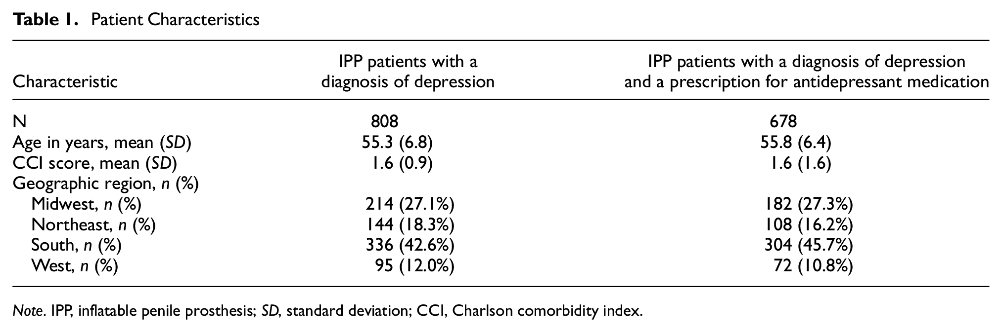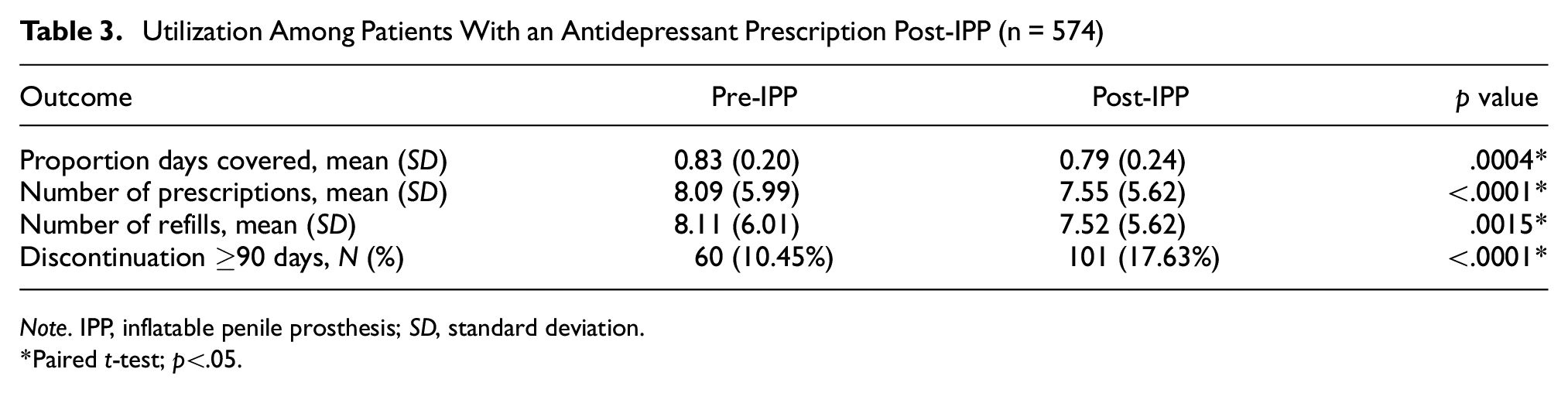 A total of 678 men diagnosed with depression who underwent IPP and who had an antidepressant medication prescription during the 1-year pre-IPP period were identified. The average age was 55.8 (±6.4) and the mean CCI score was 1.6 (±1.6) pre-IPP (Table 1). Of these patients, 104 (15%) had no antidepressant prescriptions in the post-IPP follow-up period, representing a complete stop of antidepressant medication treatment. The remaining 574 men who did not completely stop their antidepressant medication usage post-IPP (Table 3) received significantly fewer antidepressant prescriptions (7.55 vs. 8.09,