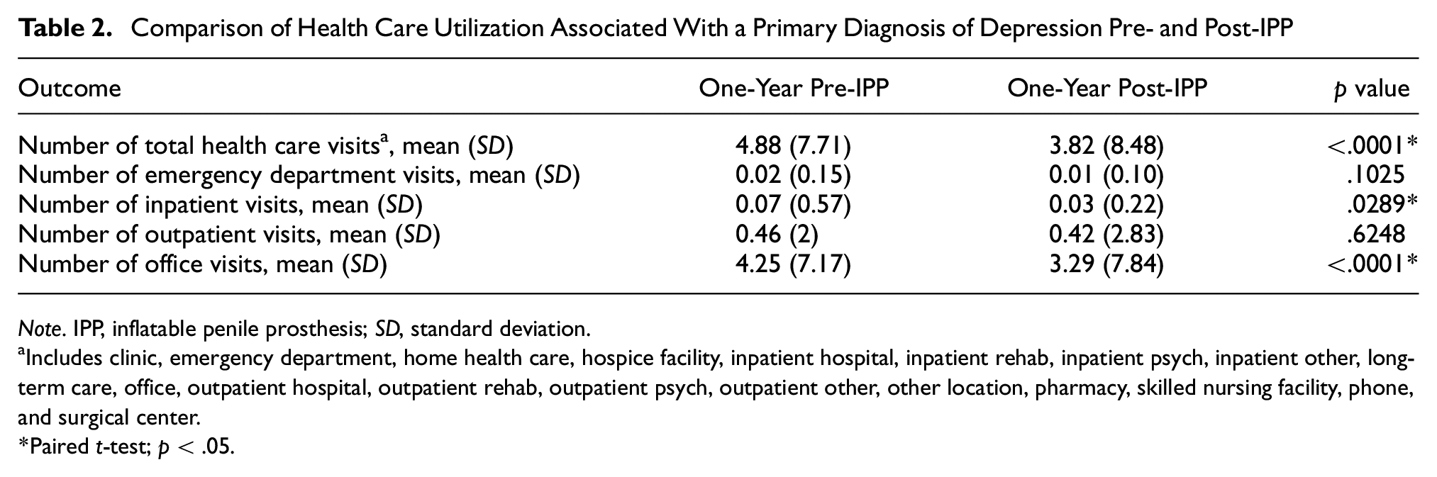 Previous research has observed improvements in depressive symptoms following treatment of ED, including treatment with IPP (Khera et al., 2018; Nackeeran et al., 2021). Limited evidence is available to quantify the association of IPP with subsequent depression-related health care utilization. This study aimed to evaluate health care utilization associated with depression among commercially insured men in the United States who received an IPP to test a hypothesis that the utilization of total health care resources, including emergency department, inpatient, outpatient, and office visits, as well as antidepressant medication use, would be reduced following IPP implantation.