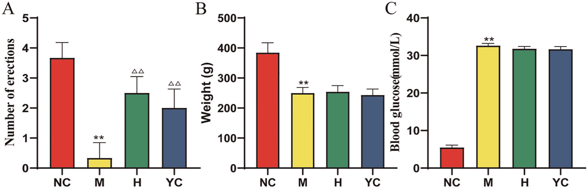 After the drug intervention, the number of erections in rats from M group decreased significantly compared to those of NC group, while YC and H groups showed notable improvement in the number of erections compared with M group (Figure 1A). However, the body weight did not change significantly for M group compared with NC group or for H and YC groups in comparison with M group (Figure 1B). Similarly, the blood glucose levels were not significantly different between the NC and M groups or when comparing the H and YC groups with the M group (Figure 1C).