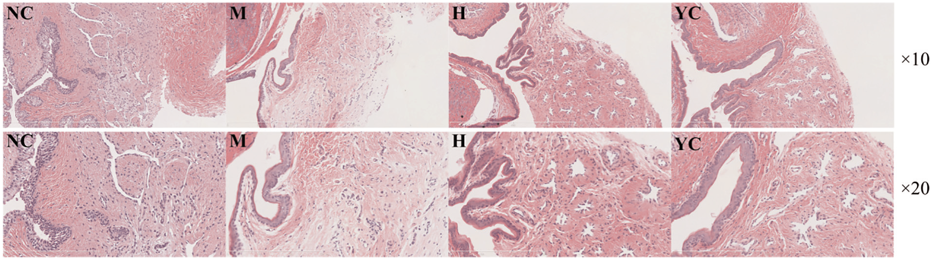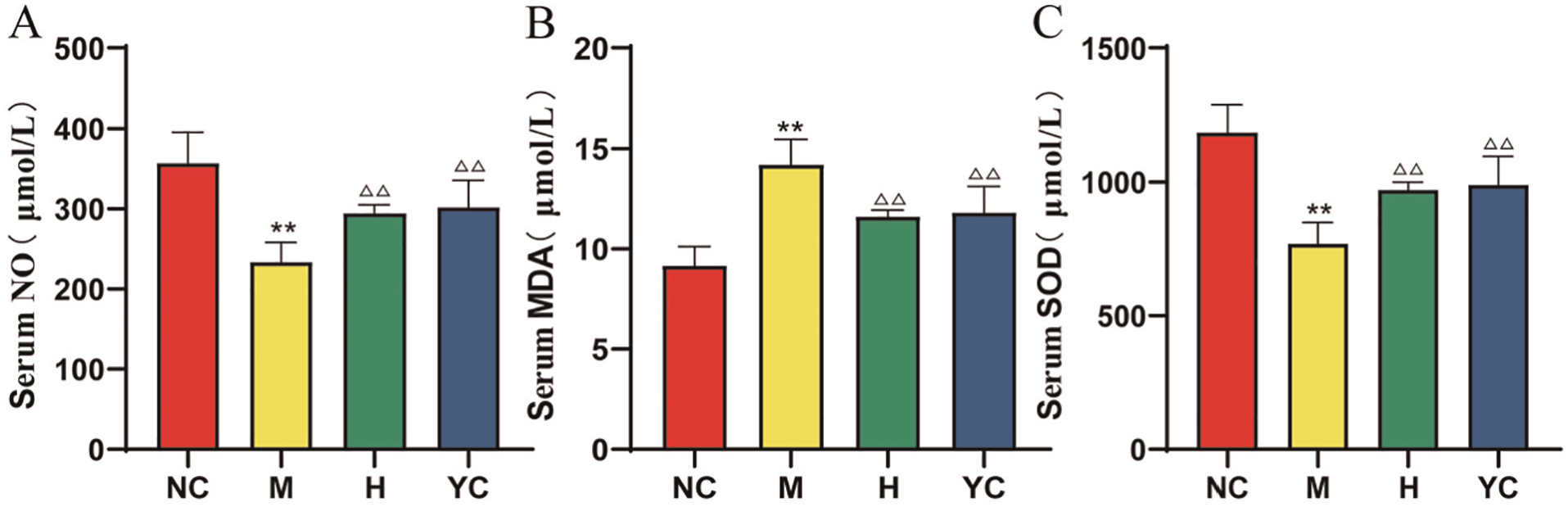 Serum levels of NO and SOD were significantly lower in M group compared with NC group but significantly higher in YC and H groups compared with M group (Figure 3A and C). However, serum levels of MDA were significantly higher in M group compared with NC group but significantly lower in YC and H groups compared with M group (Figure 3B).