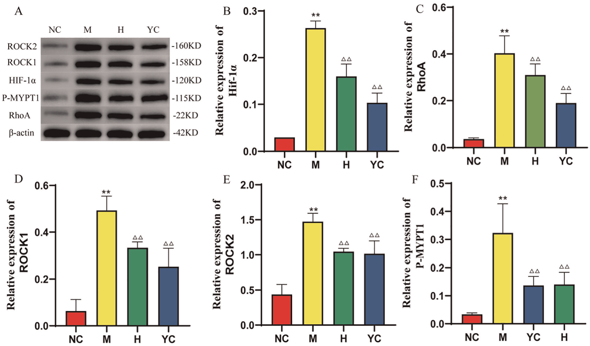 The relative expressions of HIF-1α, RhoA, ROCK1, ROCK2, and P-MYPT1 in the penile corpus cavernosum of M group were significantly higher compared with NC group, while those of H and YC groups were significantly lower compared with M group (Figure 4A–F).