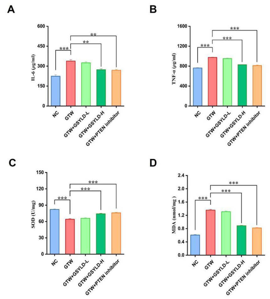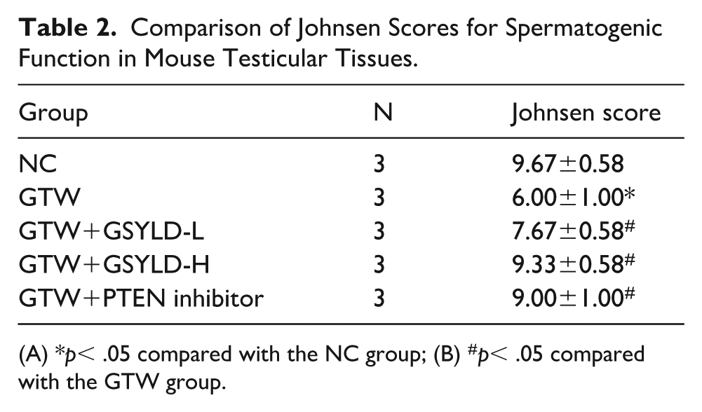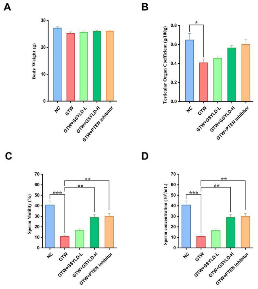 Our results demonstrate that administration of high-dose GSYLD significantly alleviated GTW-induced spermatogenic dysfunction, an improvement comparable to PTEN inhibition. This was evidenced by the recovery of sperm parameters, reduced testicular pathological injury, alongside decreased levels of IL-6, TNF-α, and MDA, and restored antioxidant capacity (SOD). These findings suggest that the therapeutic effects may be attributed to the effective regulation of the