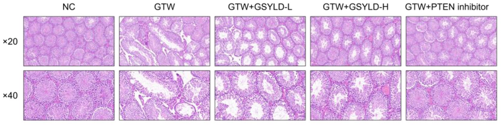Following one week of acclimatization, all mice were weighed and randomly assigned using a random number table to the following groups: normal control (NC), model (GTW), low-dose intervention (GSYLD-L, 0.27 g/kg/d), high-dose intervention (GSYLD-H, 1.08 g/kg/d), and PTEN inhibitor (GSYLD-H, 1.08 g/kg/d combined with PTEN inhibitor 0.3 mg/kg). The NC group served as the untreated control and received a daily dose of distilled water (10 mL/kg). To establish the model of spermatogenesis dysfunction, the remaining experimental groups were administered GTW (Zhejiang Deende Pharmaceutical Co., Ltd., batch no. 2310122B) via daily intragastric gavage at a dose of 10 mL/kg/day. This volume delivered a daily GTW concentration of 40 mg/kg, based on a formulation of 4 mg GTW per 1 mL.