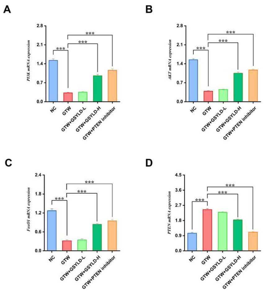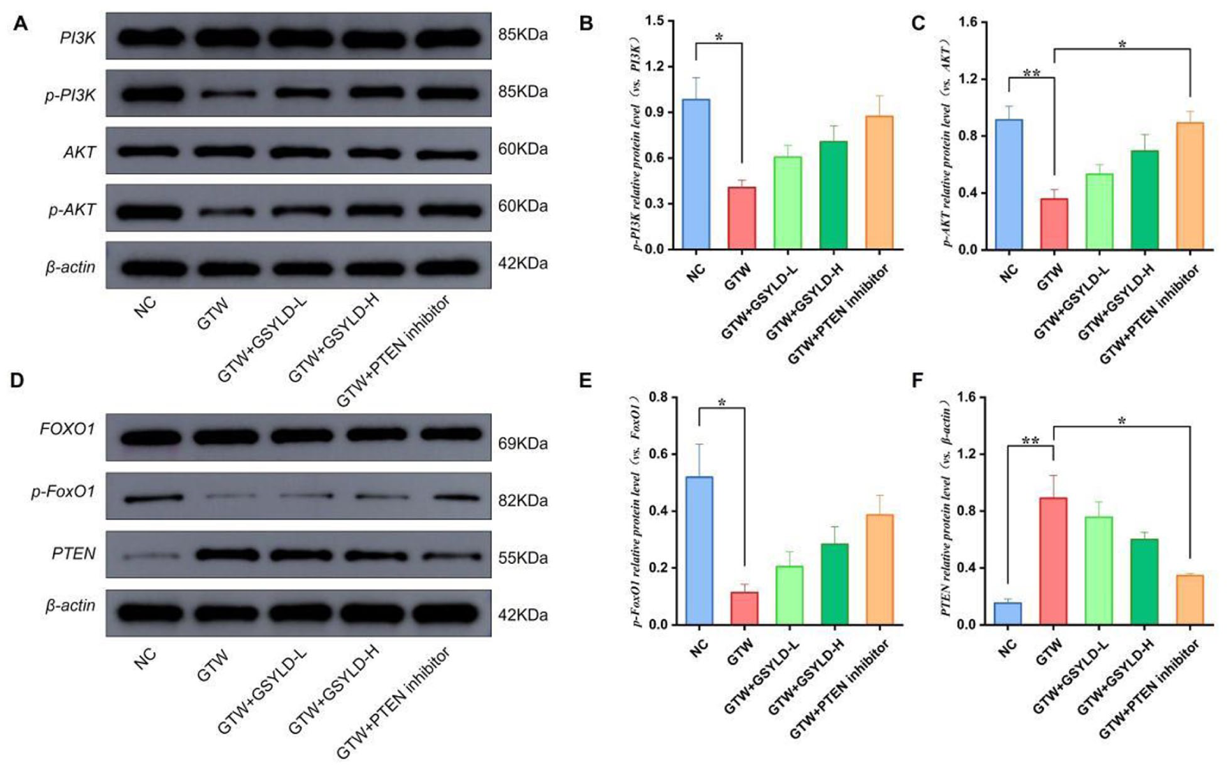 Western blot analysis revealed a significant disruption of the PTEN/PI3K/AKT pathway in the GTW group relative to the NC group, characterized by downregulated phosphorylation of both PI3K and FoxO1 (