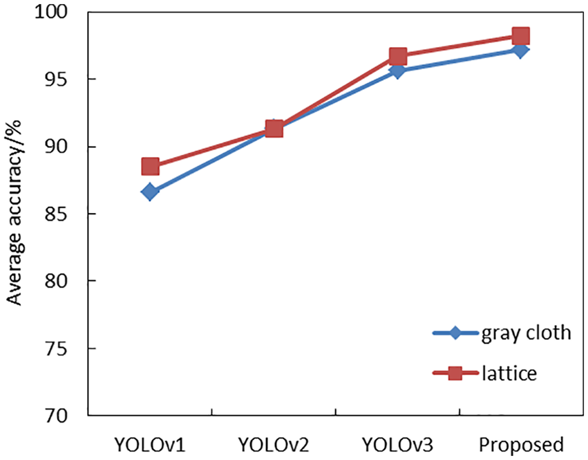 To verify the performance of the network, the improved network model was compared with other networks on the test data set. Compared with the average accuracy of the network, under the same parameters, the experimental results are shown in Figure 11. The improved network model has a large improvement on the gray cloth and the lattice fabric, which can better detect the fabric defects.