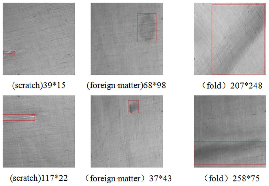 The main defect types in gray cloth include scratch, foreign matter, and fold. The scratches are mainly characterized by fine stripes. The foreign matter is expressed as a region with obvious contrast with the background color. The fold is characterized by partial protrusion or depression. The three types of defects have obvious differences in appearance, and each type of defect sample is similar.