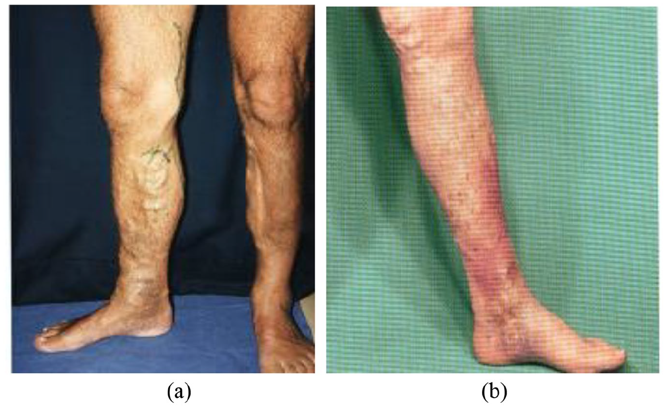 Examples of leg conditions: (a) varicose veins and (b) lipodermatosclerosis.
