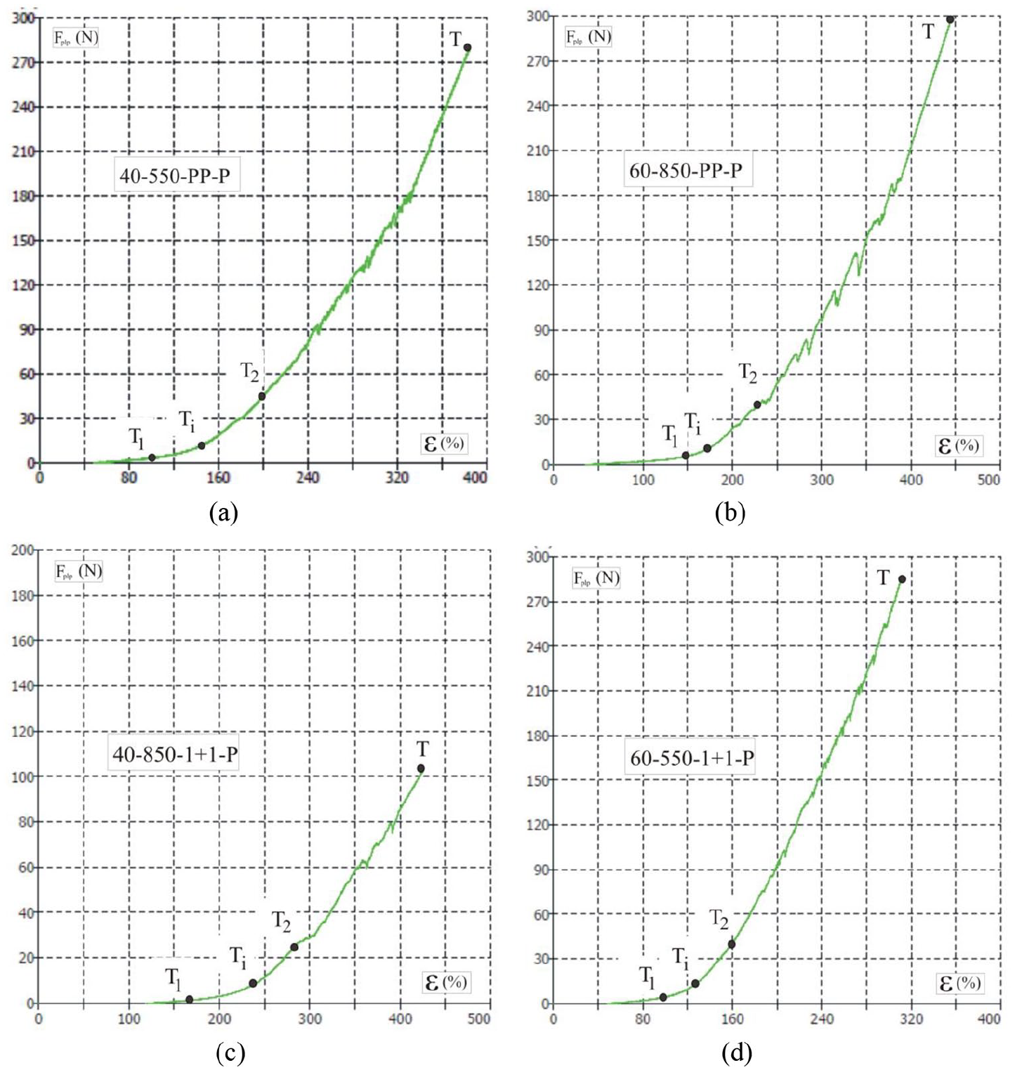 Force-elongation diagrams in the course direction of the structure of preventive compression stockings made with polyamide microfilament and elastane yarns: (a) plated knitted fabric, yarn count 40 dtex, loop sinking depth 550, (b) plated knitted fabric, yarn count 60 dtex, loop sinking depth 850, (c) partially plated knitted fabric 1 + 1, yarn count 40 dtex, loop sinking depth 850 and (d) partially plated knitted fabric 1 + 1, yarn count 60 dtex, loop sinking depth 550.