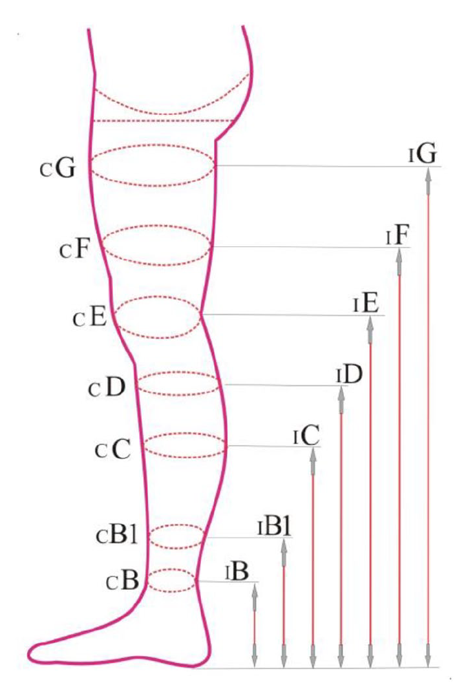 By increasing the loop sinking depth from 550 to 850 control units, the knitted length of basic yarns into a course also increased from 874 to 1167 mm or from 2.19 to 2.92 mm per loop. Consequently, the knitted fabric elongation in the course direction or transversely increased to 288% to 500%. The produced elastic tubular knitted fabric has the width 98 to 113 mm or circumference 196 to 226 mm. On European market, the most common healthy leg circumferences above the ankle (position b-b) are 19 to 29 cm, where there are 11 sizes separated by the 1 cm gap, Table 4, Figure 5. 33 For the given sizes, crotch circumferences (position g-g) are 44 to 64 cm, and for plus-size people 53 to 77 cm. Measurements and circumferences of sick legs are significantly different and very often they are not the same in the legs of one person.5,17,34