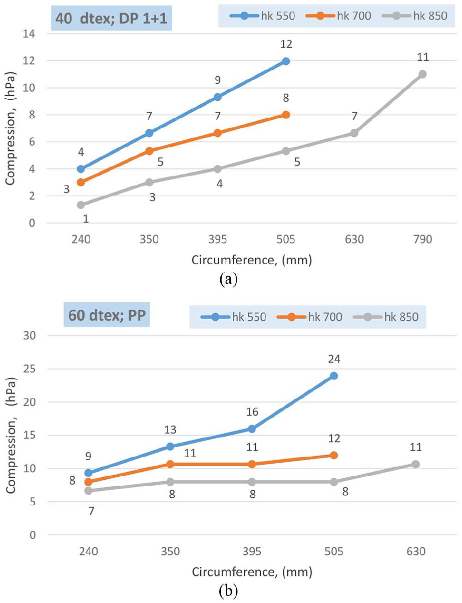 Among all of the knitted fabric samples analysed here, those made with basic PA yarn in 60 dtex in plated structure exert the largest compression on the surface, Table 8 and Figure 6(b). The samples made at the loop sinking depth 550 have the circumference 200 mm and achieve the compression 9 to 24 hPa or twice as large as the samples made in partially plated structure 1 + 1 at the identical loop sinking depth and the used ground yarn in the count 40 dtex. The compressions achieved by the tubular knitted fabric made at the loop sinking depths of 700 and 850 are appropriate to make above-the-knee part of the leg of maternity preventive stockings or preventive compression stockings intended for a recreational athlete.