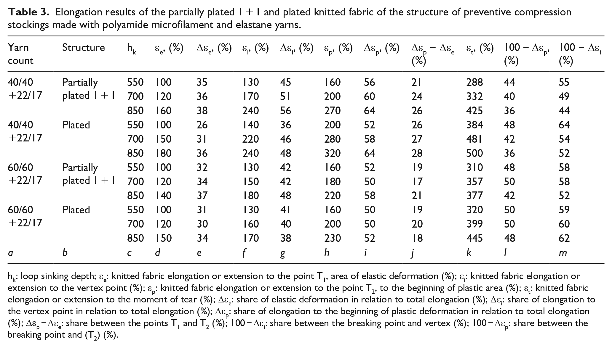 Elongation results of the partially plated 1 + 1 and plated knitted fabric of the structure of preventive compression stockings made with polyamide microfilament and elastane yarns.