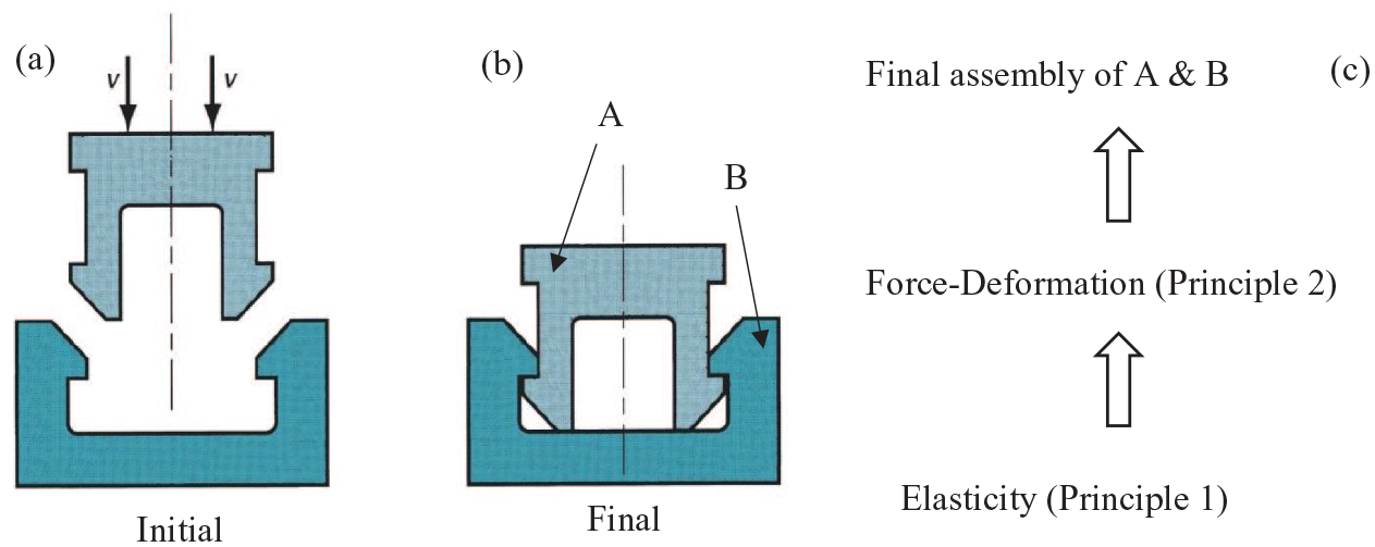 A design theory refers to the knowledge of explaining the quality of the structure of a product to meet the design requirement pertinent to it. A general design theory refers to the knowledge suitable to all types of products (e.g. apparel products, car products, etc.), while a specific design theory refers to the knowledge available to a specific type of products, for example, car product, apparel product. It is worth mentioning that the general and specific theories here follow the so-called information relativity principle 8 ; see also Figure 1, where an example is illustrated for the information relativity principle. Specifically, in Figure 1(c), the principle 2 gives an account for the phenomenon of the final state of the assembly of parts (A and B), but the principle 2 is a phenomenon (in itself), which is accounted for by the principle 1. As such, the principle 2 serves as a principle while at the same time it serves as a phenomenon. By the way, a design methodology refers to approaches to address problems in design processes.