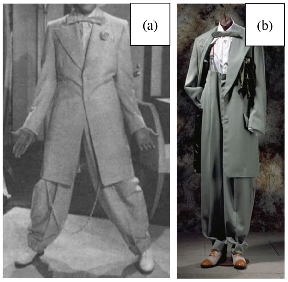The zoot suit is a fashion of design in the apparel history. 32 It has high-waist, wide-legged, tight-cuffed, pegged trousers, and a long and oversized jacket with giant collars and wide padded shoulders (Figure 3(a) and (b)).33,34 The following are some consensuses about the zoot design in the apparel design community.