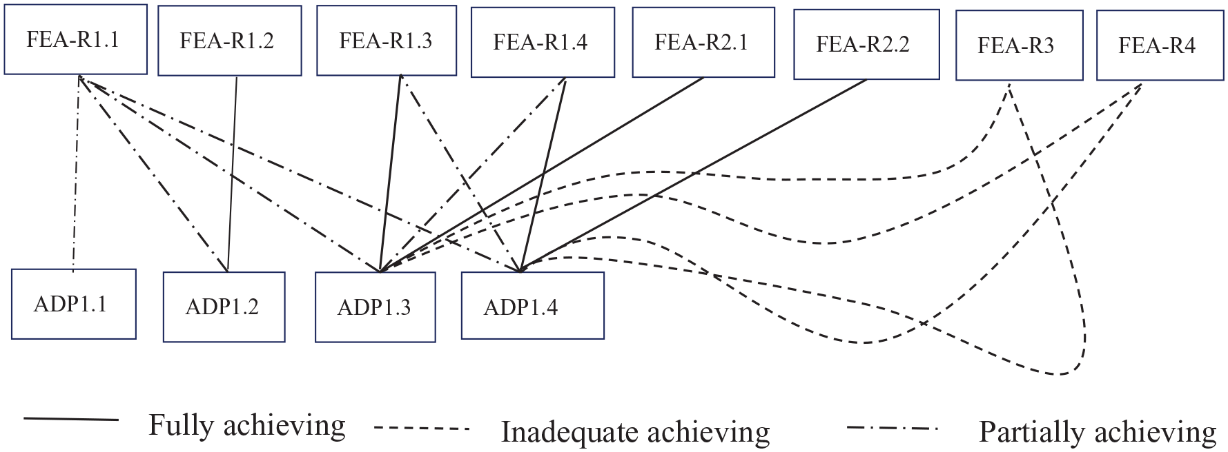Figure 4 shows the association (coupling and redundancy) between the apparel design parameter (ADP) and the functional, ergonomic, and aesthetic requirements (FEA-R). From Figure 3, the following observations can be made. Observation (1): ADP1.3 and ADP1.4 couple FEA-R1.3 and FEA-R1.4 in that ADP1.3 (ADP1.4) fully achieves FEA-R1.3 (FEA-R1.4) while partially achieving FEA-R1.4 (FEA-R1.3). Observation (2): There is a redundancy design, that is, ADP1.3 fulfills FEA-R1.3 in full while partially fulfills FEA-R1.4, and ADP1.4 fulfills FEA-R1.4 in full while partially fulfils FEA-R1; in other words, to fulfill FEA-R1.3 (FER-R1.4), ADP1.4 (ADP1.3) makes redundancy with ADP1.3 (ADP1.4) in part.