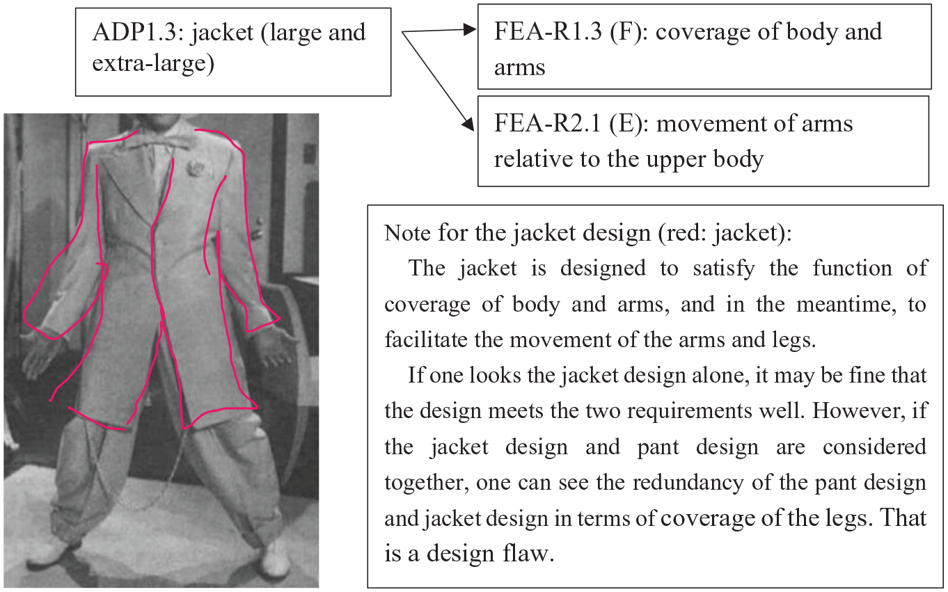Remark 3: The above design has a design flaw (Flaw 1) – that is from the point of view of the coverage function (FEA-R1.3 (F) and FEA-R1.4 (F), respectively); the jacket and pant have a coupling to the functional requirement category, that is, violating Axiom 1a (ADT-FA). This error agrees with Consensus 1 (critique).