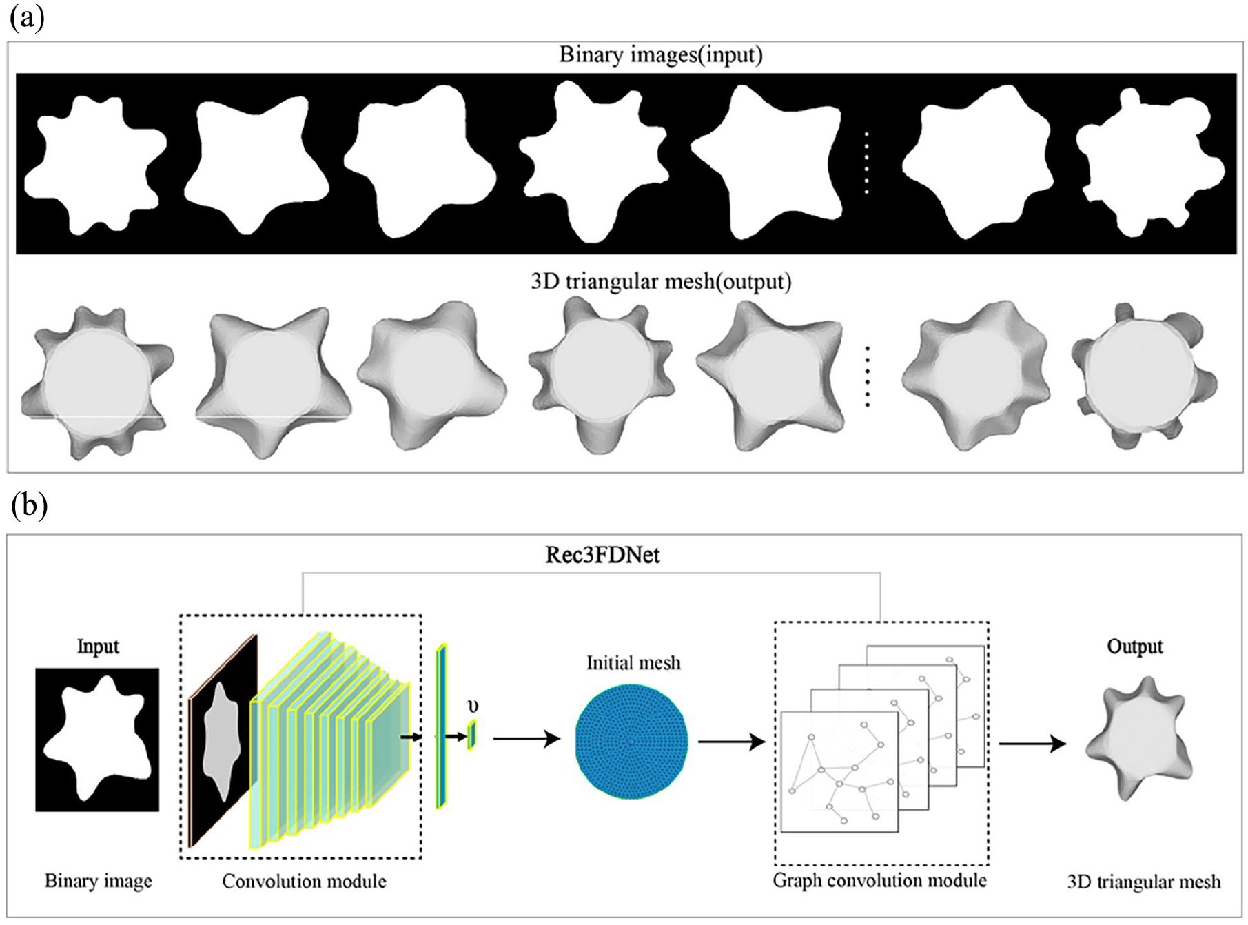 The pipeline of reconstructing topologically consistent 3D fabric drape was shown in Figure 1. Before reconstructing, a 3D fabric drape model dataset Ddrape that corresponds one-to-one between binary images and 3D fabric drape models was constructed. As shown in Figure 1(a), Ddrape includes a binary image (input) and a 3D triangular mesh (output). To reconstructed 3D fabric drape model based on the binary image, a reconstruction network named Rec3FDNet (