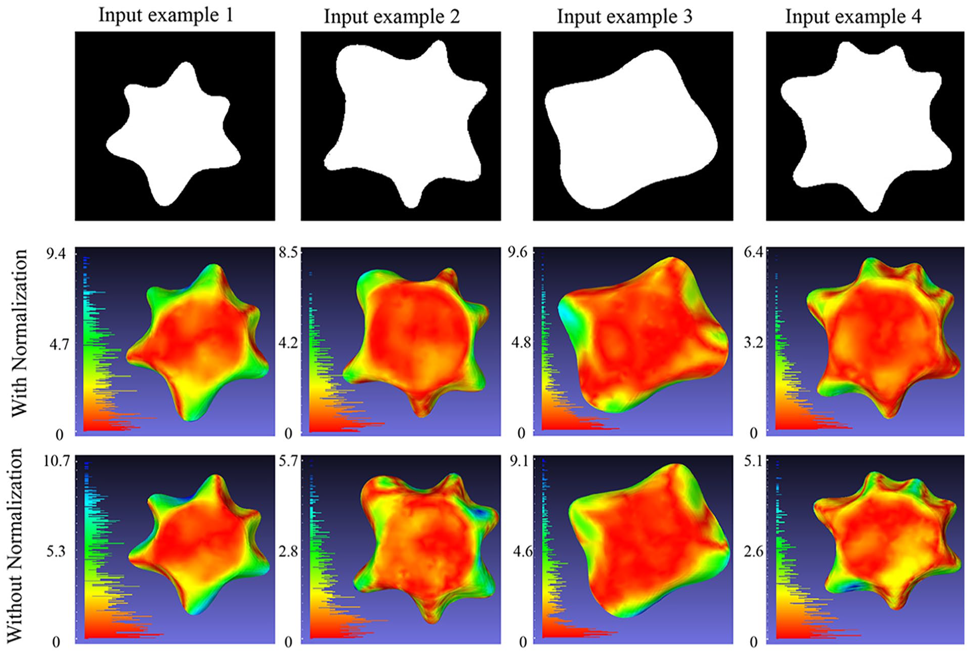Comparison shows that normalization of 3D fabric drape model does not fundamentally improve the accuracy of reconstruction. For example, the maximum error of output example 1 in third row is 10.7 mm, and the maximum error of example 1 in second row is 9.4 mm. The maximum error of Example 2 in third row is 5.7 mm, which is smaller than the 8.5 mm in second row. This means that due to the same structure of Rec3FDNet, normalization of 3D fabric drape models did not significantly improve the reconstruction accuracy. However, considering that normalization of 3D fabric drape models can improve accelerate the training of Rec3FDNet, normalization of 3D fabric drape models will be added in subsequent experiments.