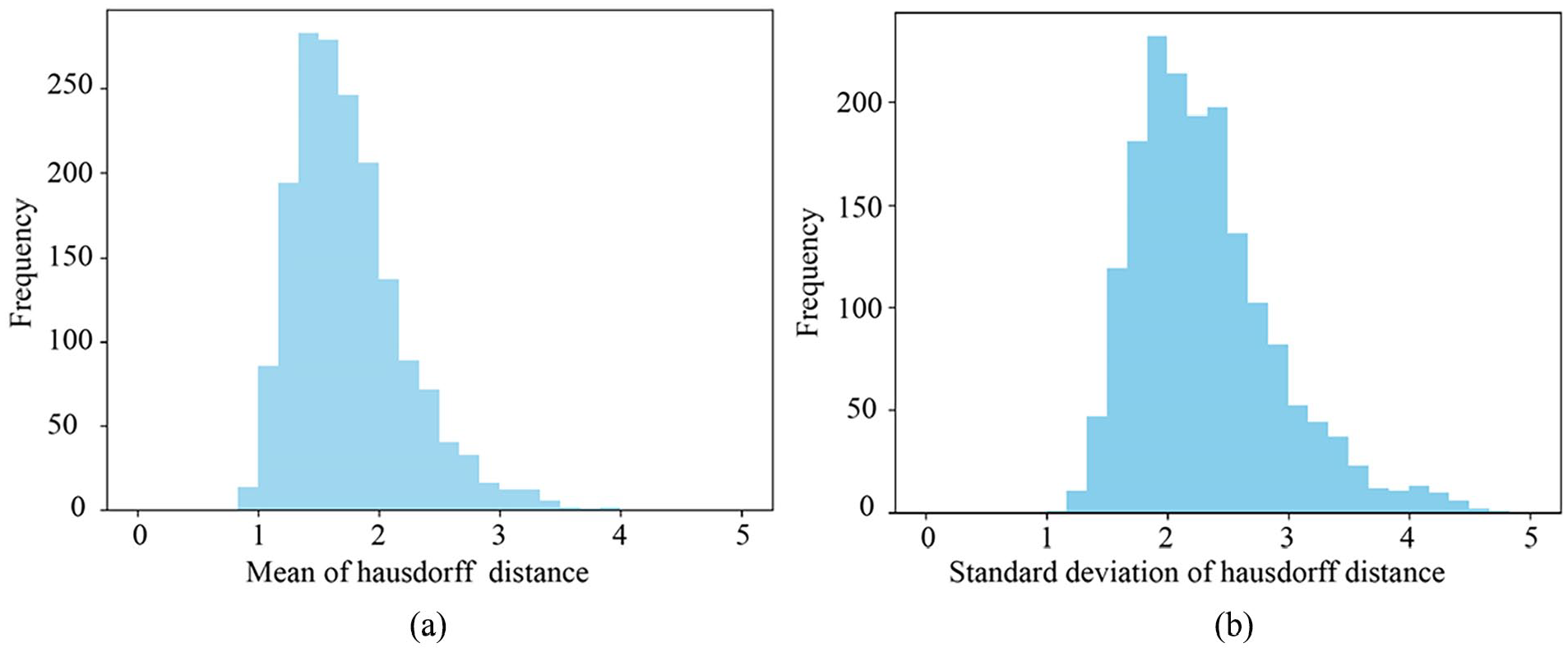 Histogram of Hausdorff distance distribution of test samples. (a) The mean of hausdorff distance. (b) The standard deviation of hausdorff distance.