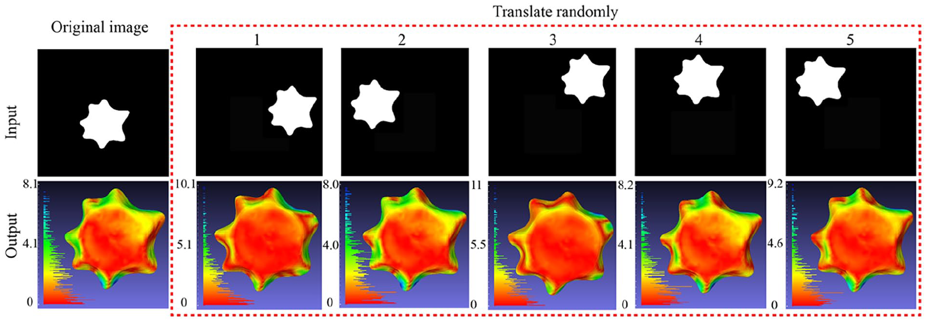 In order to test the stability of Rec3FDNet, the binary image of draped fabric were randomly translated (up, down, left, right) as shown in Figure 13. The original image as well as translated images were input to trained Rec3FDNet. The corresponding reconstructed 3D fabric drape models were shown in Figure 13. It’s observed despite of the arbitrary translating of fabric drape, 3D fabric drape models with accuracy detail could be reconstructed with trained Rec3FDNet. The error histogram shown in each sub-graph show that the error of each model is below 11 mm. The error distribution is dominated by small errors, with fewer obvious errors. This indicates that Rec3FDNet has good stability toward the input image. However Rec3FDNet may sometimes perform poorly. As shown in the second row and fourth column of Figure 13, the peak distribution of the draped fabric is relatively smooth, which is significantly different from the real 3D fabric drape model. This may be because when augmenting training data drape image was translated randomly with a normal distribution. Therefore, the vast majority of drape images fluctuate near the center of the image. If the data augmentation of training set is not enough, the trained Rec3FDNet may perform poorly for some rare training samples. The drape image in the column 4 of Figure 13 was located in the upper right corner of the entire binary image. It may be one of the rare samples. Therefore, the next steps of this study can be focused on expanding the training set purposefully and retraining Rec3FDNet.