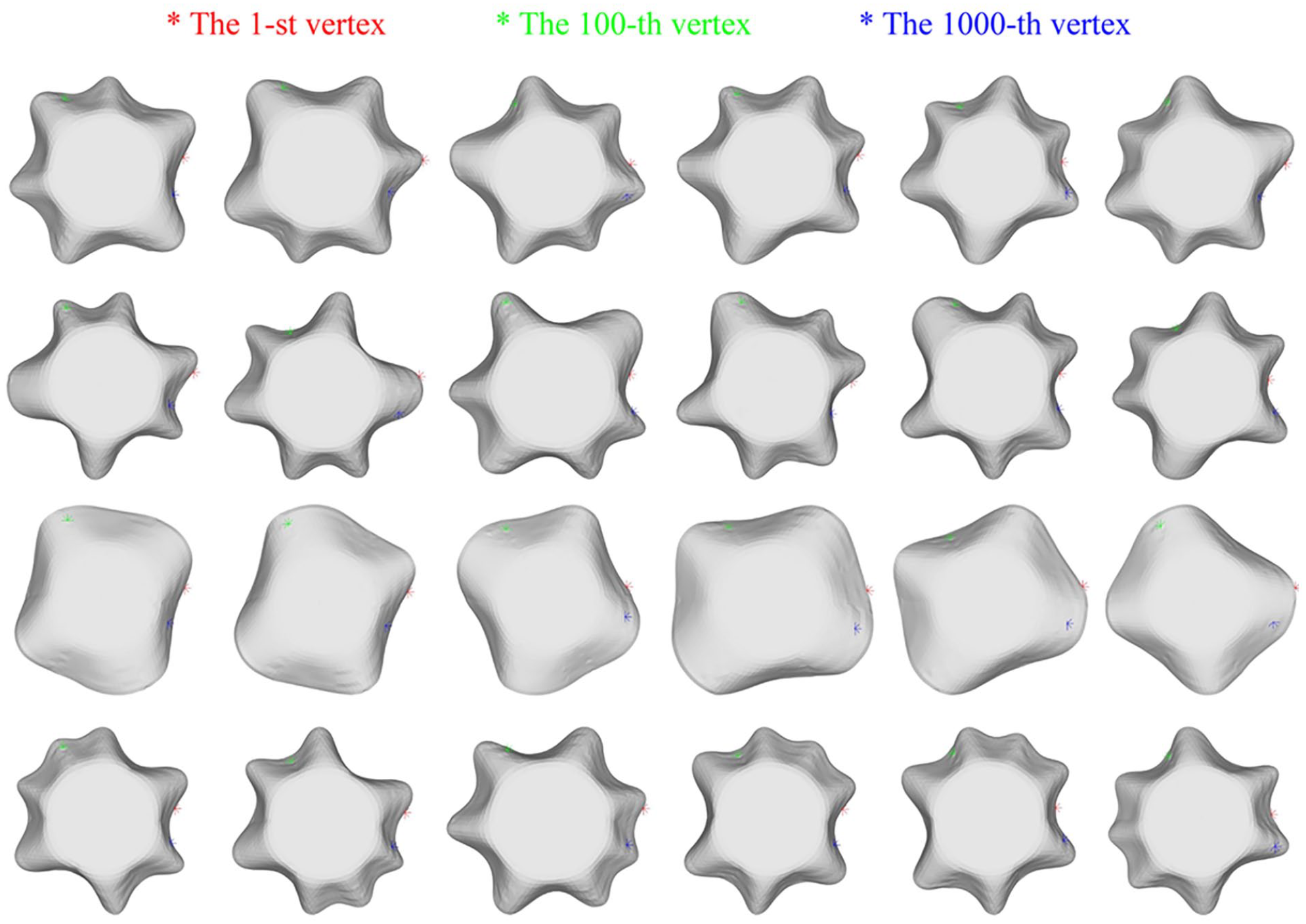 All the reconstructed meshes in this study were deformed from the initial mesh, therefore theoretically all the reconstructed models share the same number and ordering of vertices. To verify the conclusion, three vertices of reconstructed 3D fabric drape models were shown in Figure 14. Where the point marked in red asterisks (*) is the first point of the reconstructed model, the point marked in green asterisks is the 100th point of the reconstructed model and the point marked in blue asterisks is the 1000th point. As shown in Figure 14, the 1st vertex is on the right side of the reconstructed model in all the different models. The 100th vertices are all on the lower right side of the reconstructed model. The 1000th vertices are all on the upper left side of the reconstructed model.