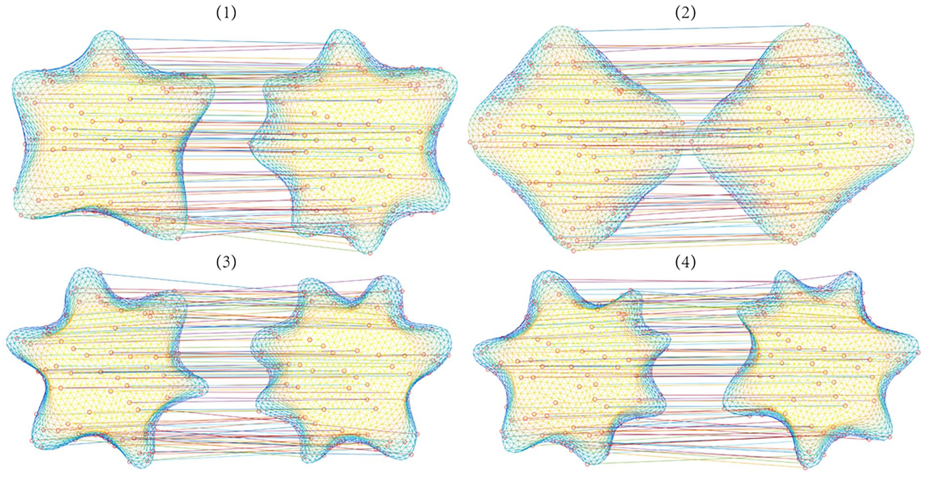 To verify the topology of different reconstructed fabric drape models, the lines between two vertices which own the same index in two arbitrary reconstructed 3D fabric drape models were drawn. As shown in Figure 15, the lines between two vertices which own the same index in the four mesh pairs were almost parallel. There are few intersecting lines in the four mesh pairs. The result shows that the vertices which own the same index in different reconstructed fabric drape models share the same orientation. The results shown in Figures 14 and 15 indicate that the reconstructed models still share the same topology. This result proves that the models reconstructed by Rec3FDNet do not require point cloud denoising and resampling, which provides a feasible method for the scale reconstruction of 3D fabric drape models.