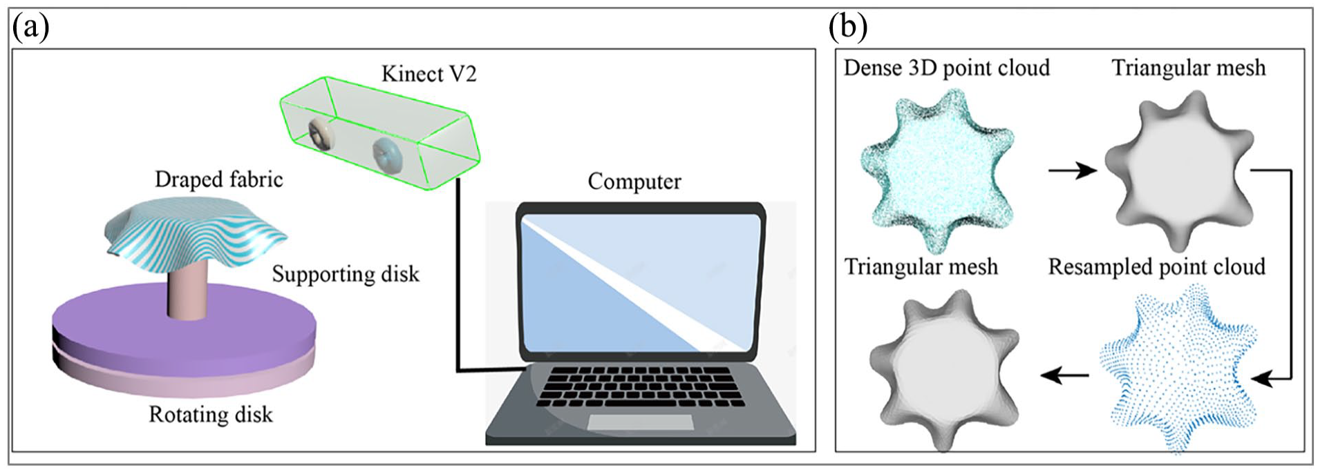 The drape performance of fabrics refers to the three-dimensional (3D) deformation of fabrics in their natural drape state, which is one of the manifestations of the mechanical properties and structural parameters of fabrics. The beautiful drape is one of the priority factors in clothing design and home textile design, therefor it is meaningful to systematically evaluate and analyze the drape performance of fabrics.1–5 In the study of fabric drape, the research object could be a two-dimensional (2D) projection or a 3D model (point cloud or triangular mesh) of draped fabric. The acquisition of 2D projection of draped fabric is relatively simple, however some useful information may be ignored during converting the 3D model into 2D projection. With the improvement of computer hardware, more and more researchers turn to 3D fabric drape models as the research object of fabric drape performance. 6 For example, Wang et al. 7 first projected the panoramic grating image onto the surface of the draped fabric, and then extracted contour information from the panoramic grating image. By calculating the height of the grating stripes on the surface of draped fabric, the 3D coordinates of each grating sampling point on the draped fabric were finally obtained. This method provides a feasible approach for collecting 3D fabric drape models, but due to the panoramic grating being directly above the draped fabric, fabrics with good drape performance, such as silk fabrics, have self occlusion during draping, and the panoramic grating cannot reconstruct such kind of fabrics. In response to this phenomenon, Mah et al. 8 collected point clouds of a 3D fabric drape model using a 3D human scanner and studied the distribution of distances between different cross-sectional contour lines of the draped fabric and the supporting cylinder. Mah et al. pointed out that the distance distribution of 3D fabric drape models can better characterize the drape performance of fabrics than traditional 2D projection. However, due to the use of equidistant cross-sectional contour, the drape degree of different fabrics is not comparable. Therefore, their proposed method makes the comparability of different drape models not strong enough. In order to reconstruct a 3D fabric drape model using a portable device, Hu 9 obtained dozens of image sequences of the draped fabric with a smartphone camera, and then a 3D color model of the draped fabric was reconstructed by matching feature points between the images. 10 Although this method simplifies the device, it sacrifices the efficiency of 3D reconstruction. In order to improve the collection efficiency, Yu et al. 11 combined multiple depth cameras and Zhang Zhengyou calibration method 12 to fuse the depth information collected by multiple cameras into the same world coordinate system, achieving the scanning reconstruction of a 3D fabric drape model. Although the time required to collect a single drape model is considerable, the results obtained by this method are dense 3D point clouds. When analyzing the results, tedious steps such as denoising, encapsulation, and resampling need to be performed on the 3D point clouds. Note: unless otherwise specified, the term 3D fabric drape model in this paper refers to a 3D triangular mesh of draped fabric.