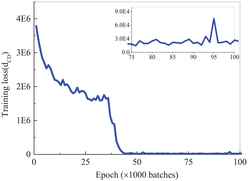 When normalization was used in training Rec3FDNet the relationship between training epoch and training loss was shown in Figure 10. It is obvious that with normalization Rec3FDNet shows significant convergence after training 3000 batches, and the training loss has been reduced to a very low level. That is to say the training loss in Figure 10 performs better than training loss in Figure 6 (without normalization of 3D fabric drape model). The reason for this result may be the difference in the fitting range of Rec3FDNet. When the 3D drape model is not normalized, the Rec3FDNet needs to continuously adjust the weights so that the coordinates of the output point cloud are in the range of −120 to 120. When the 3D drape model is normalized, the Rec3FDNet needs to continuously adjust the weights so that the coordinates of the output point cloud are in the range of −1 to 1. Since the initialization of the weights of Rec3FDNet is in the range of −1 to 1, the Rec3FDNet requires relatively shorter iteration steps to converge if 3D drape model is normalized. Therefore, when the learning rate of Rec3FDNet is the same, the iterative steps required for the training of Rec3FDNet are relatively short if the 3D drape model is normalized, and longer if the 3D drape model is not normalized. Coupled with the fact that the training of Rec3FDNet is characterized by random fluctuations, the longer training steps will increase the instability factor, therefore when the 3D drape model is normalized the training of Rec3FDNet is relatively less difficult.