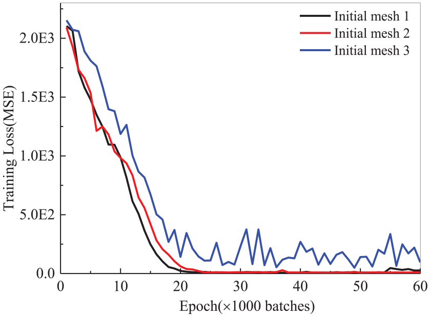 Under the same training conditions (initial mesh 1, training batch size 8, without normalization of 3D fabric drape models), the performance of the two loss functions are shown in Figures 6 and 7. As shown in Figure 6, when the loss function is MSE, the training loss can converge at 25,000 batches and fluctuate around 7.5. As shown in Figure 7, when