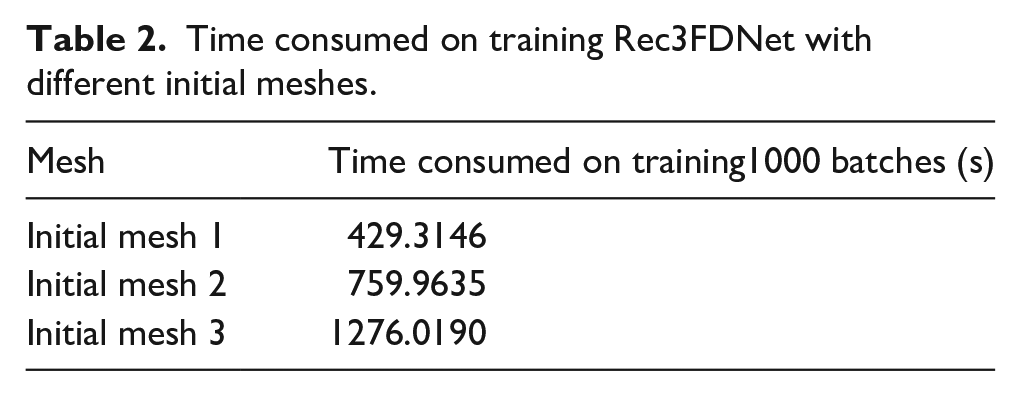 The time consumption on training Rec3FDNet with different initial meshes were shown in Table 2. The training batch size was set to 8. As shown in Table 2, under the same training hyper-parameters, initial mesh 1 corresponding to the smallest training time. When initial mesh 3 was used, it takes 1276.0190 s to train every 1000 batches, which is a significant increase in time compared to initial meshes1 and 2. This is because the more vertices in the initial mesh, the more weights need to be optimized, and the higher the difficulty and time cost of training Rec3FDNet.