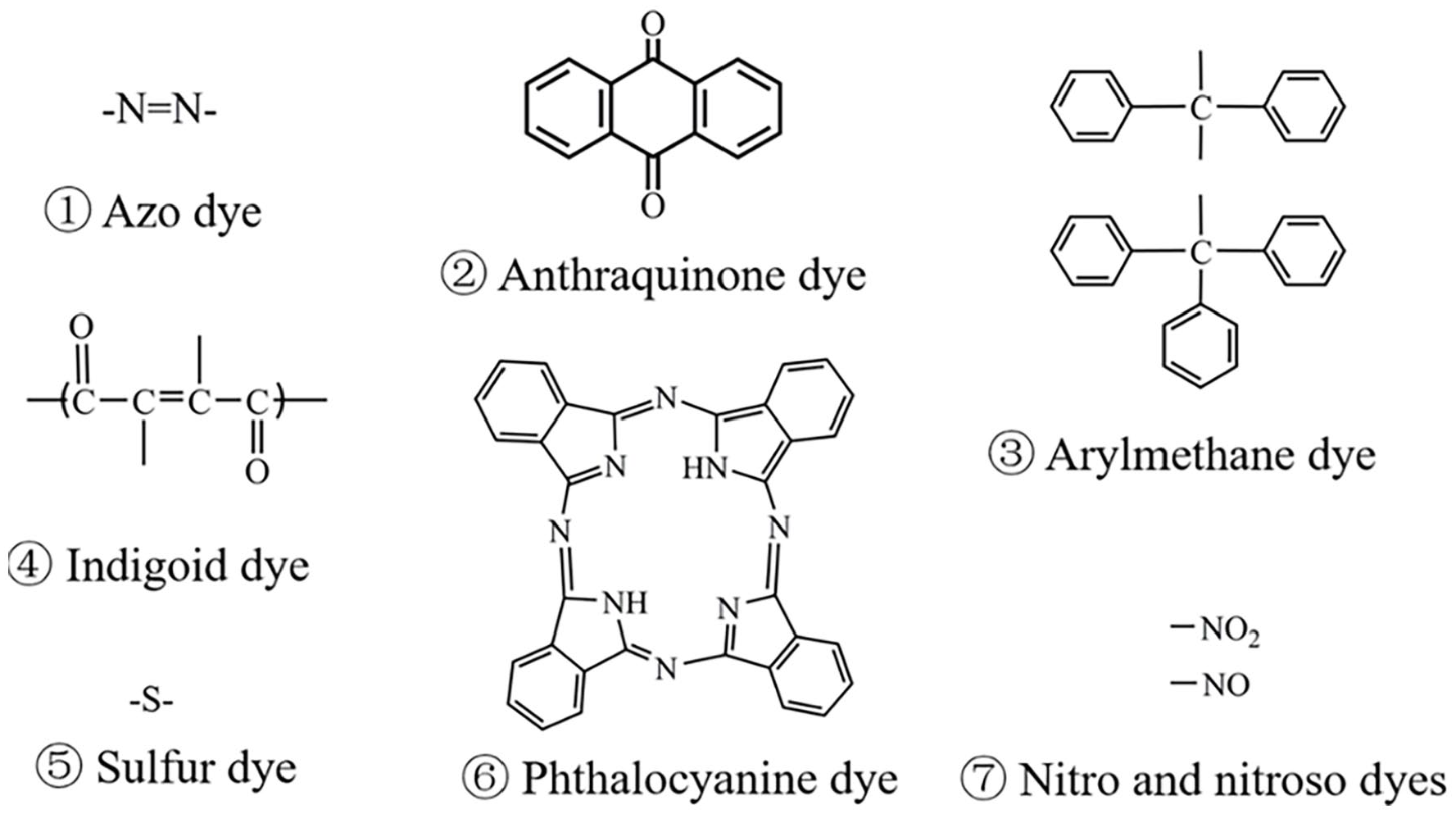 The color of clothing is required to be both esthetically appealing and resistant to the effects of washing. Consequently, the molecular structure of synthetic dyes is complex and stable, which mainly consists of two key components: the chromogenic group mainly responsible for fabric dyeing, and the auxochrome group, such as halogen, —SO3H, —NH2, —OH, —COOH, and —CH3. The auxochrome group can improve the water solubility of dyes and augment the affinity between fibers and dyes by receiving electrons or releasing electrons. 24 Since Perkins unexpectedly discovered aniline violet in 1856, there have been over 10,000 types of synthetic dyes worldwide, with an annual production of approximately 700,000 tons. According to the particle charge upon dissolution in water, synthetic dyes can be divided into cationic dyes (alkaline dyes), anionic dyes (acidic, direct, and reactive dyes), and nonionic dyes (dispersed dyes). Dyes may also be classified based on their chromogenic groups, that is, azo dyes, anthraquinone dyes, arylmethane dyes, indigoid dyes, sulfur dyes, phthalocyanine dyes, and nitro and nitroso dyes, as shown in Figure 2. 25 In the dye market, azo dyes account for 60%–70% of synthetic dyes due to their bright colors and high color fastness. They have nearly 2000 varieties and the largest production, and are widely used in the printing and dyeing industry.26,27