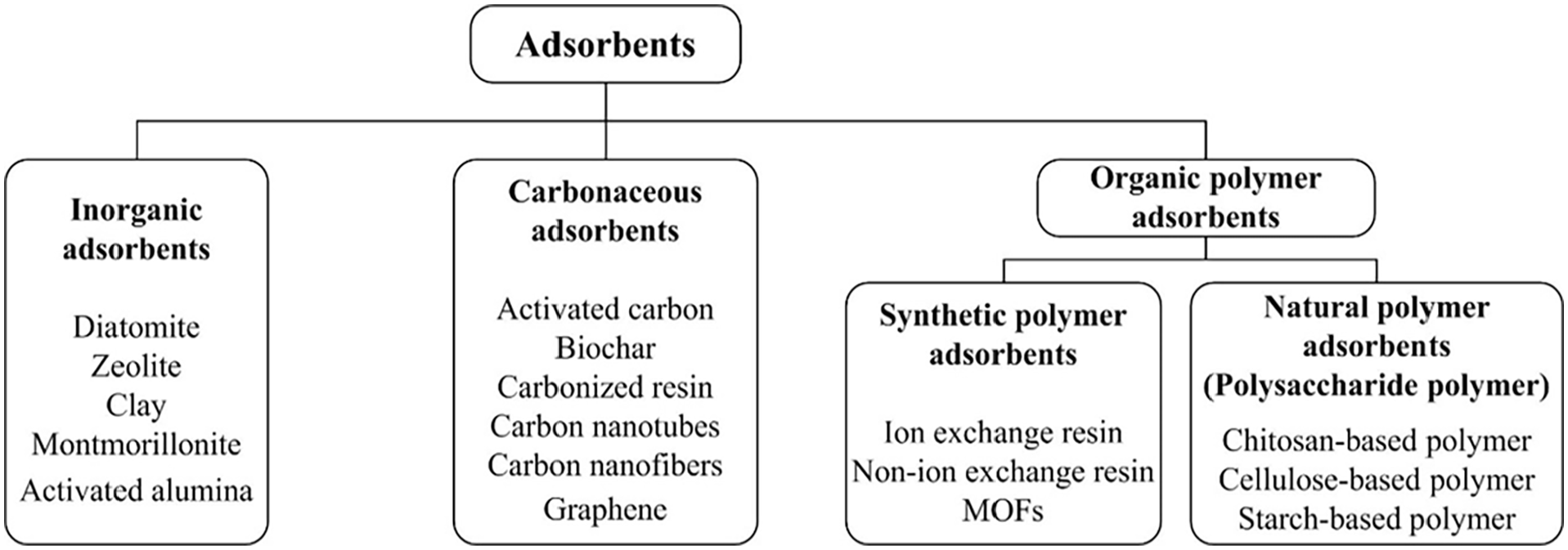 There are quite a few kinds of adsorbents. The main types of adsorbents classified by the chemical composition are shown in Figure 3.