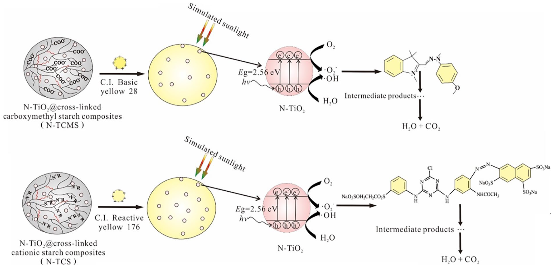 In view of the ideal results on the researches of nano-TiO2@chitosan composites and nano-TiO2@cellulose composites in adsorption-photocatalytic degradation of organic matter, our research group has synthesized nano-TiO2@starch based adsorbent composites through improved sol-gel method by using modified starch as adsorbent and carrier of nano-TiO2 for ionic dyes. 165 Under the simulated sunlight irradiation, the adsorption-photocatalytic degradation of N-TiO2@starch based adsorbent composites had obvious synergistic effect on dye treatment. During the process of adsorption-photocatalytic degradation, the TOC of dye solution decreased significantly. Moreover, the N-TiO2@starch based adsorbent composites were reusable. Figure 7 shows the mechanism for adsorption-photocatalytic degradation of ionic dyes by N-TiO2@starch based adsorbent composites.165,166