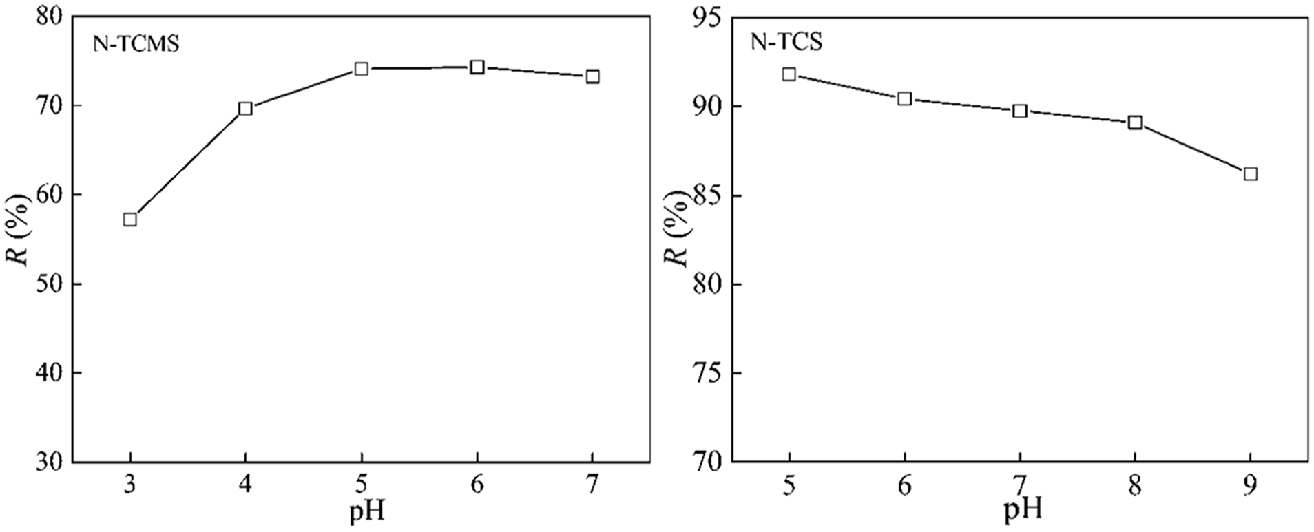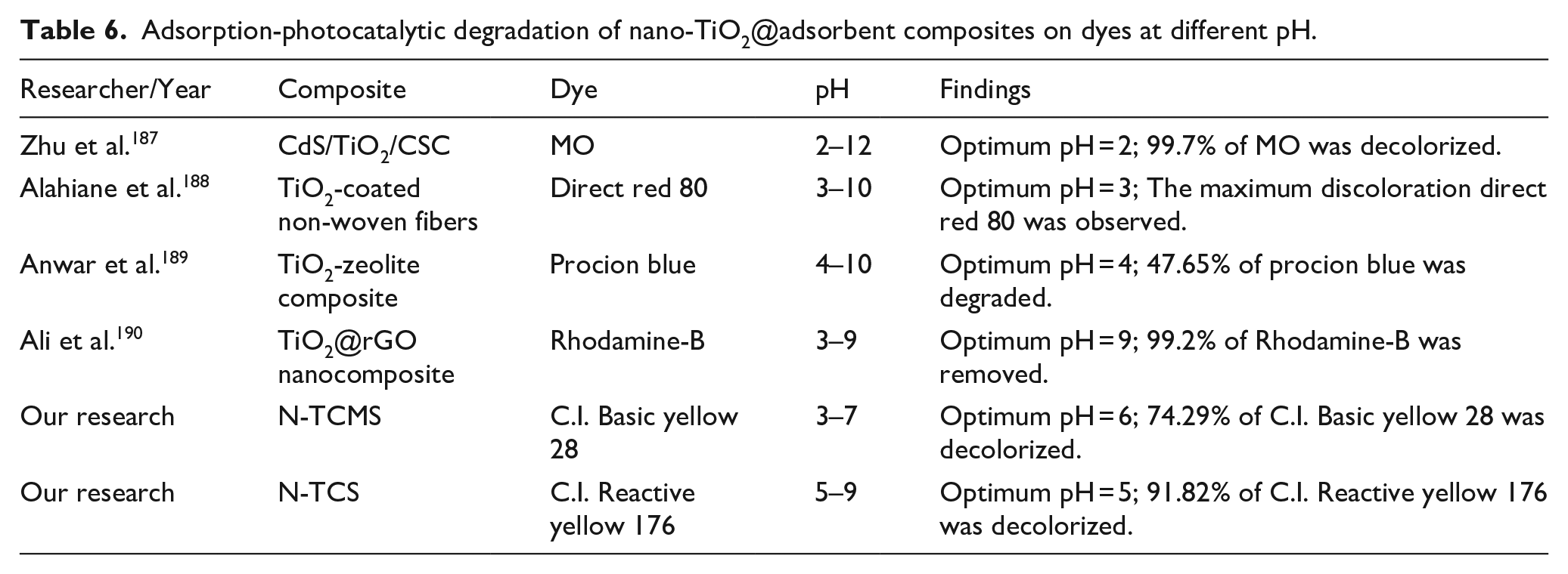 The pH of the solution is an important operating variable during dye wastewater treatment. The change of pH value of the solution will cause the change of the surface charge of the adsorbent and photocatalyst. Therefore, the pH of the solution affects the dye adsorption-photocatalytic degradation efficiency by nano-TiO2@adsorbent composites. The point zero charge (pHpzc) refers to the pH value of the solution when the surface charge of the composite is zero. The surface charge of composites is usually analyzed by pHpzc. When the solution pH is above pHpzc, the surface of the composite is negatively charged. On the contrary, the surface of the composite is positively charged.185,186 The pHpzc of the CdS nanocrystals/TiO2/crosslinked chitosan composite (CdS/TiO2/CSC) prepared by Zhu et al. 187 is 6.5. When the pH of the solution is less than 6.5, its surface is positively charged. And it was confirmed by experiments that in acidic solution, the decolorization effect of MO was the best due to the electrostatic attraction between the positively charged composite and MO anions. The pHpzc of N-TCMS and N-TCS measured by the pH drift method was 4.5 and 8.2, respectively. Therefore, the adsorption-photocatalytic degradation experiment of C.I. Basic yellow 28 by N-TCMS was carried out under the condition of solution pH > 4.5, and the adsorption-photocatalytic degradation experiment of C.I. Reactive yellow 176 by N-TCS was carried out under the condition of solution pH < 8.2. The experimental results are exhibited in Figure 8.165,166 Table 6 shows the optimal pH of nano-TiO2@adsorbent composites for dye adsorption-photocatalytic degradation.