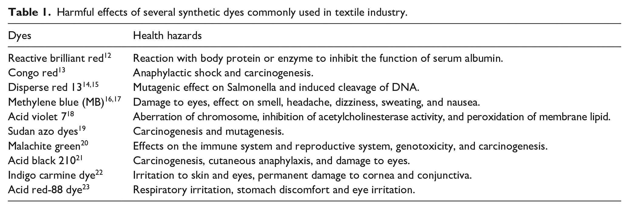 Harmful effects of several synthetic dyes commonly used in textile industry.