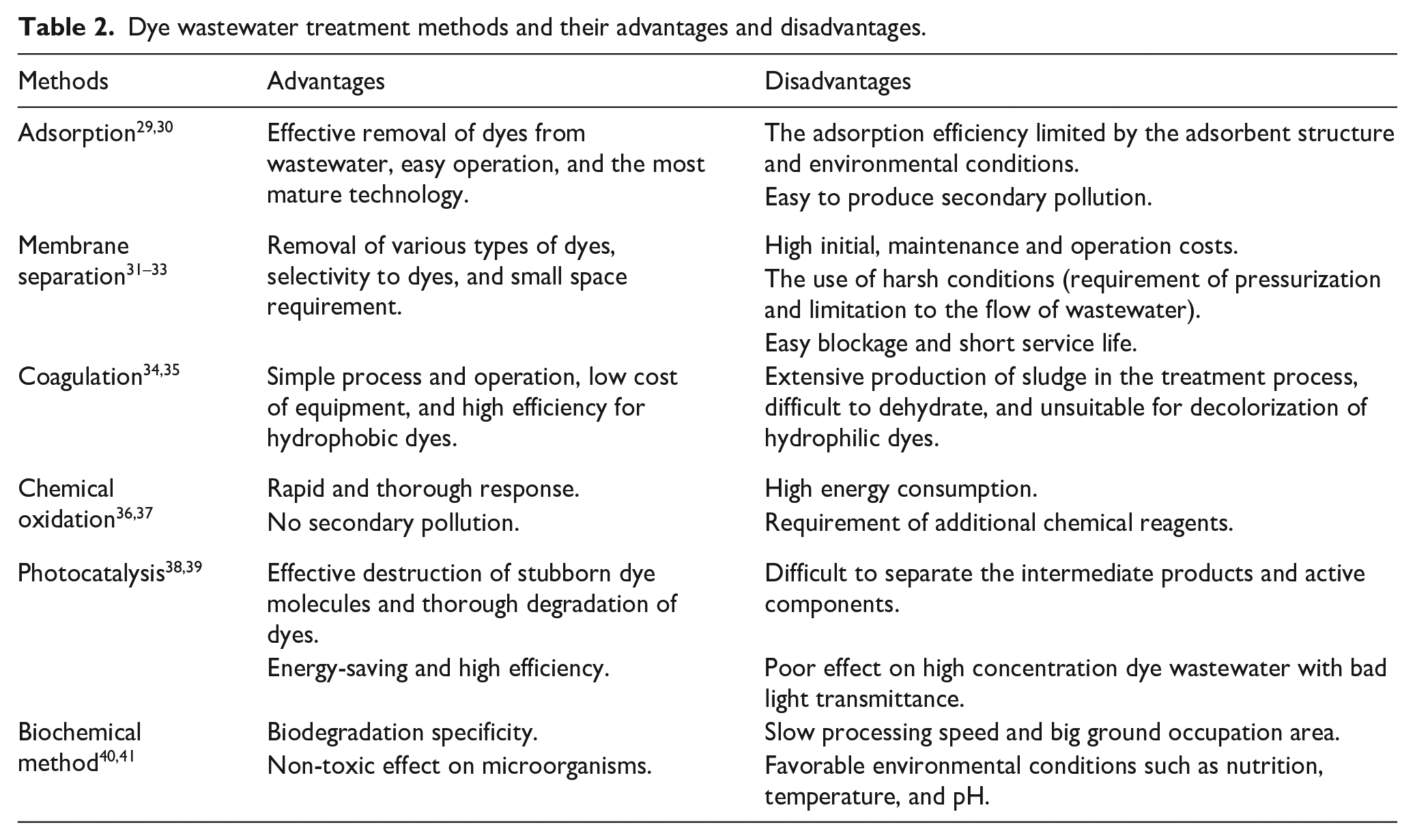 Dye wastewater treatment methods and their advantages and disadvantages.