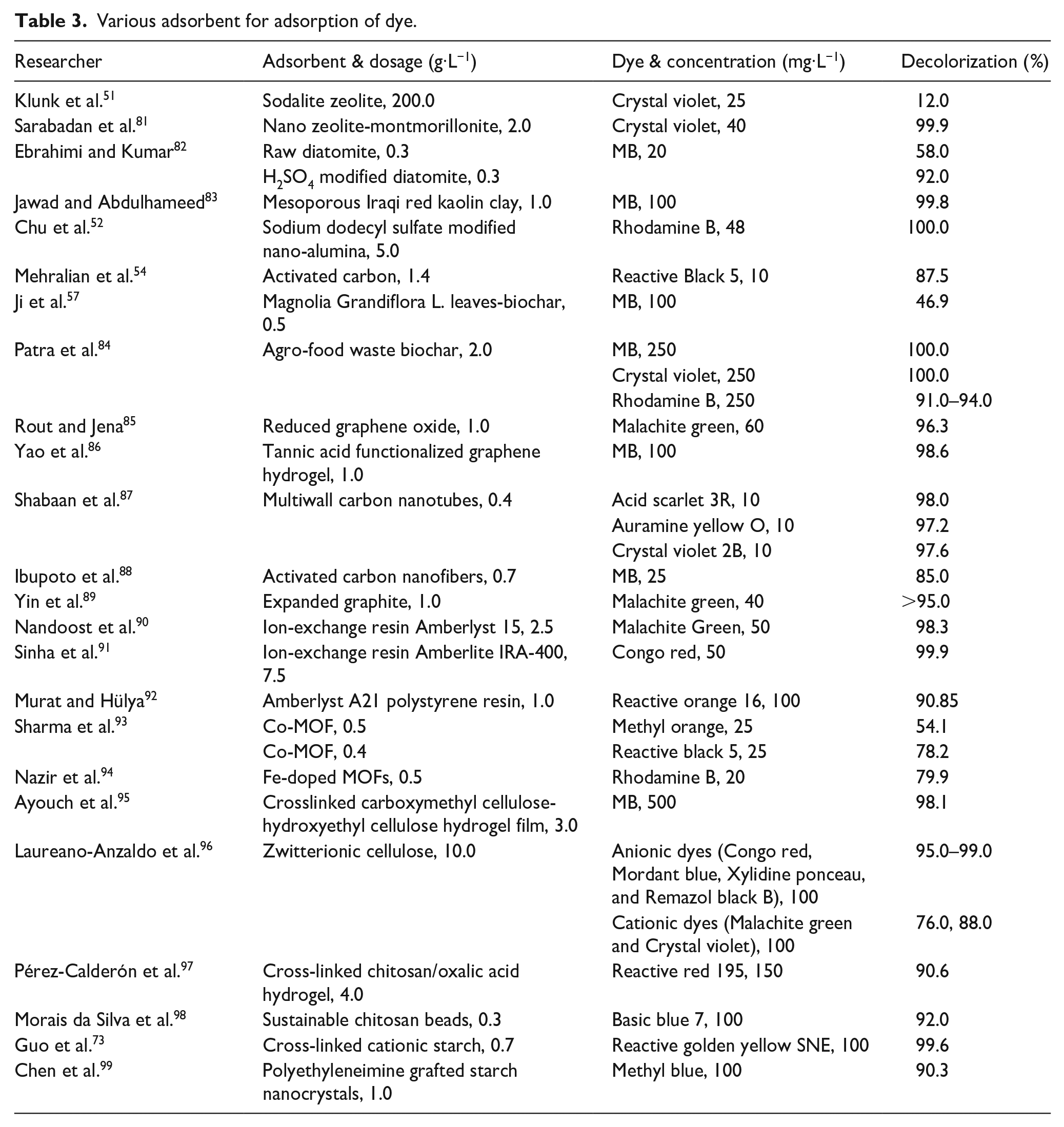 Natural polymer adsorbents mainly use some polysaccharides as the matrix, represented by-based, cellulose-based, and starch-based adsorbents.73–79 Similar to synthetic polymer adsorbents, these materials can carry various functional groups through further surface chemical modification to obtain different derivatives, thereby expanding their application range. They can not only adsorb and separate substances like inorganic adsorbents by ion exchange and the like-dissolves-like principle, but their adsorption mechanisms also include chelation, charge gravitation, van der Waals force, dipole force, and hydrogen bond. Not only that, because these materials are derived from nature and low in price, they are usually biocompatible and biodegradable materials that are renewable. The production process is environmentally friendly, which will not cause secondary pollution and reduce the impact on the environment. Therefore, natural polymer adsorbents have been paid more and more attention by scholars since their emergence, and are constantly developing toward the direction of eventually replacing synthetic polymer adsorbents. 80 The relevant researches on the dye adsorption performance of these types of adsorbents is shown in Table 3.