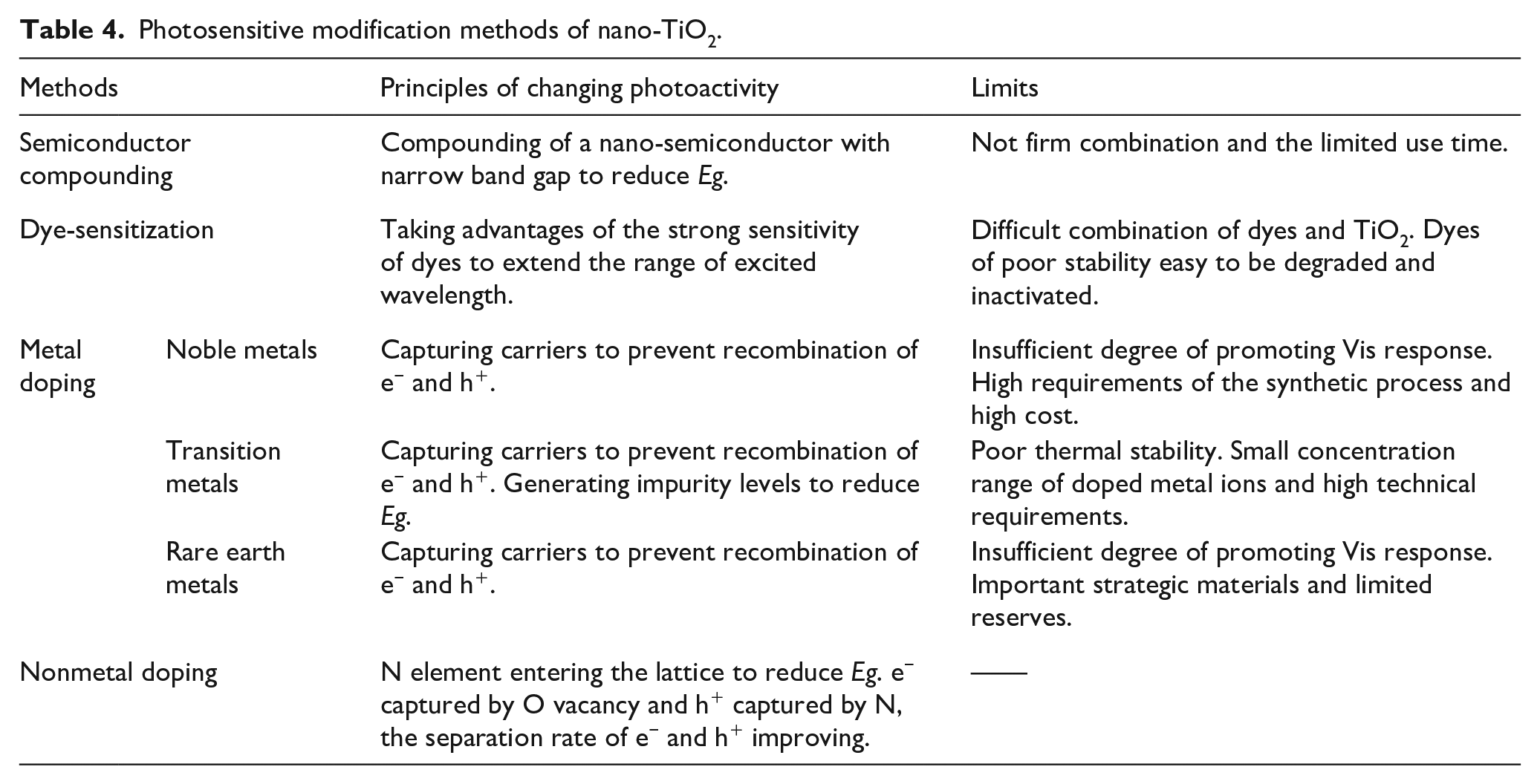 In this article, sentence “Metal doping”, “Semiconductor compounding”,“Dye-sensitization”, and “Nonmetal doping” are in a parallel relationship. They belong to “Photosensitization modification of nano-TiO2” was inadvertently added to the “Methods” section and has now been removed.